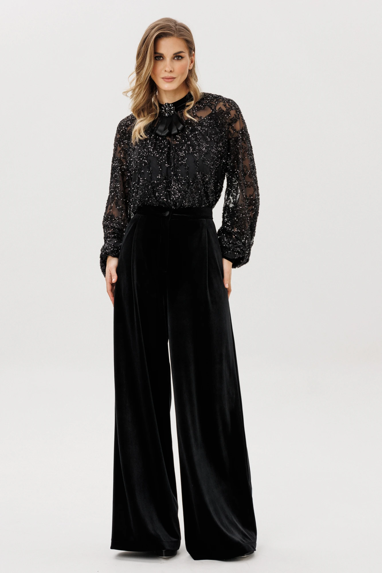 Блузка + топ. Блузка выполнена из сетки с вышивкой пайетками. Блузка прямого силуэта, длиной до линии бедер. Перед и спинка цельные, со сборкой по горловине. Воротник-стойка. Застежка сзади на две петли и пуговицы. Рукав покроя ""реглан"", одношовный, со сборкой по горловине и низу. Низ рукава на притачной манжете из велюра, застегивающейся на пуговицу. В комплект входит топ из трикотажной подкладки. Топ прямого силуэта, длиной до линии бедер, бретели регулируются по длине. В комплект входит декоративная брошь.
