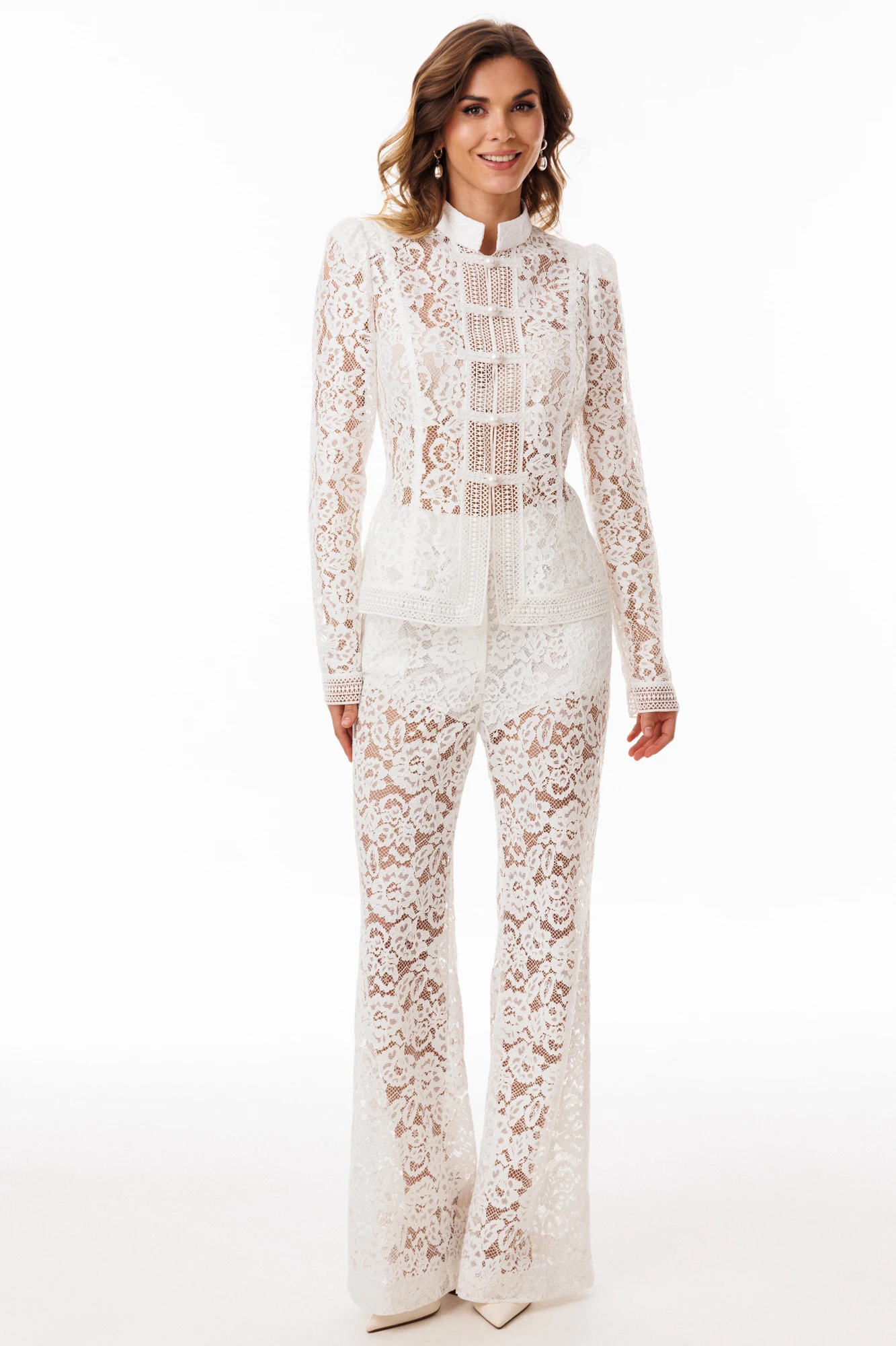 Блузка выполнена из гипюра с напылением серебристого цвета. Блузка полуприлегающего силуэта, длиной до линии бедер. По переду обработаны рельефы от плечевых швов до низа и центральная застежка до верха встык на пять навесных петель и пуговиц. На спинке обработаны талиевые вытачки. Горловина округлой формы, обработана воротником-стойкой. Плечевой шов укорочен. Рукав втачного покроя, одношовный, со сборкой по окату. Блузка декорирована притачной тесьмой по борту, низу и низу рукава.
