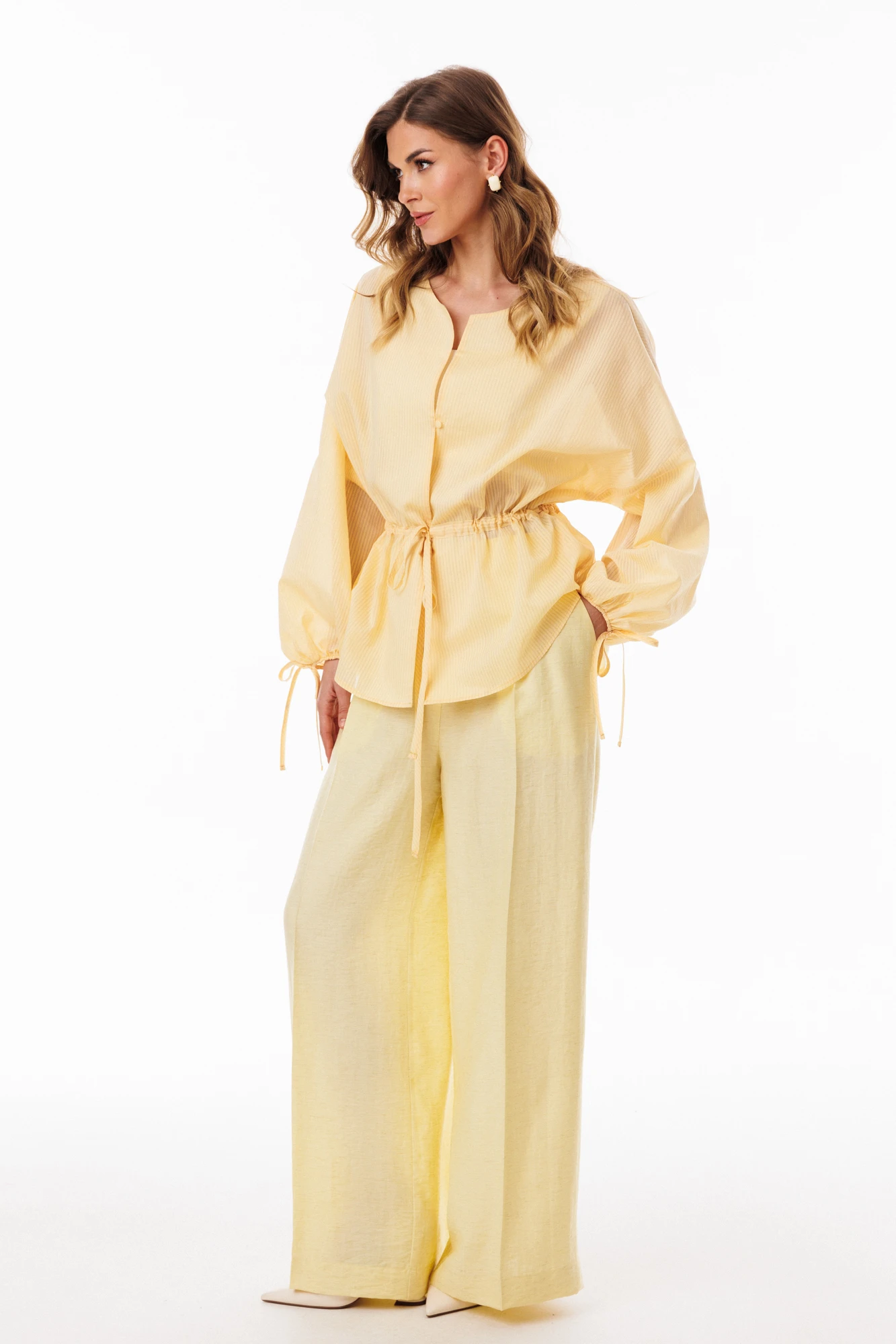 Блузка из выполнена из плательно-блузочной ткани в мелкую полоску. Блузка Х-образного силуэта, длиной до линии бедер. По переду обработана центральная застежка встык на две навесные петли и пуговицы. Спинка цельная. Горловина округлой формы. Плечевой шов удлинен. Рукав покроя кимоно, одношовный, расширенный и присборенный по низу с эластичной тесьмой. Низ рукава декорирован бантиком из основной ткани. Низ блузки фигурной формы. По линии талии обработана кулиса со шнуром из основной ткани.