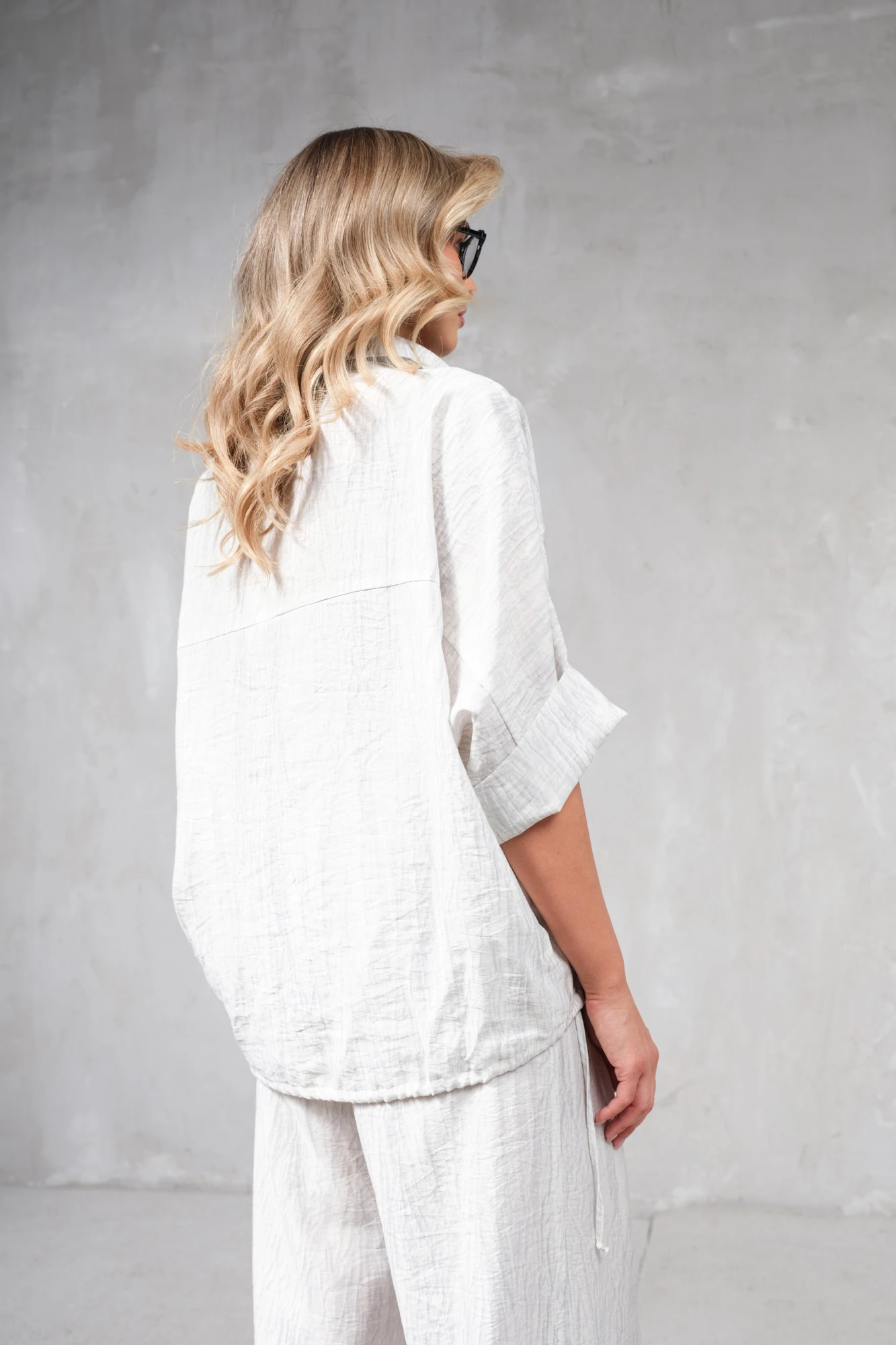 Блуза свободного силуэта, с кокеткой по переду и сзади. Застежка центральная на пуговицы. Присутствуют спереди карманы. Легкая и воздушная, она идеально подходит для теплых дней.