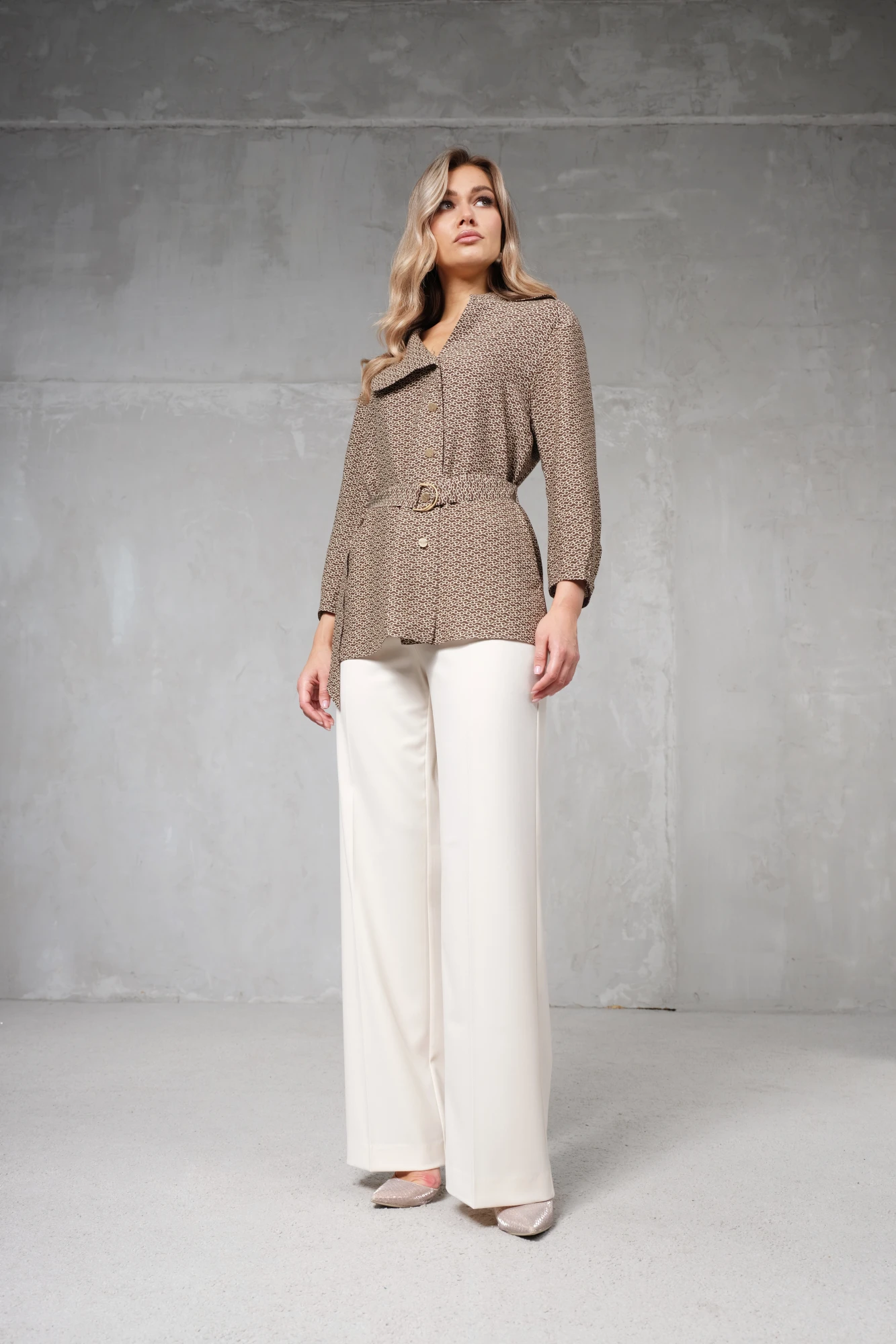 Блуза прямого силуэта, удлиненная, с застежкой впереди на петли и пуговицы.