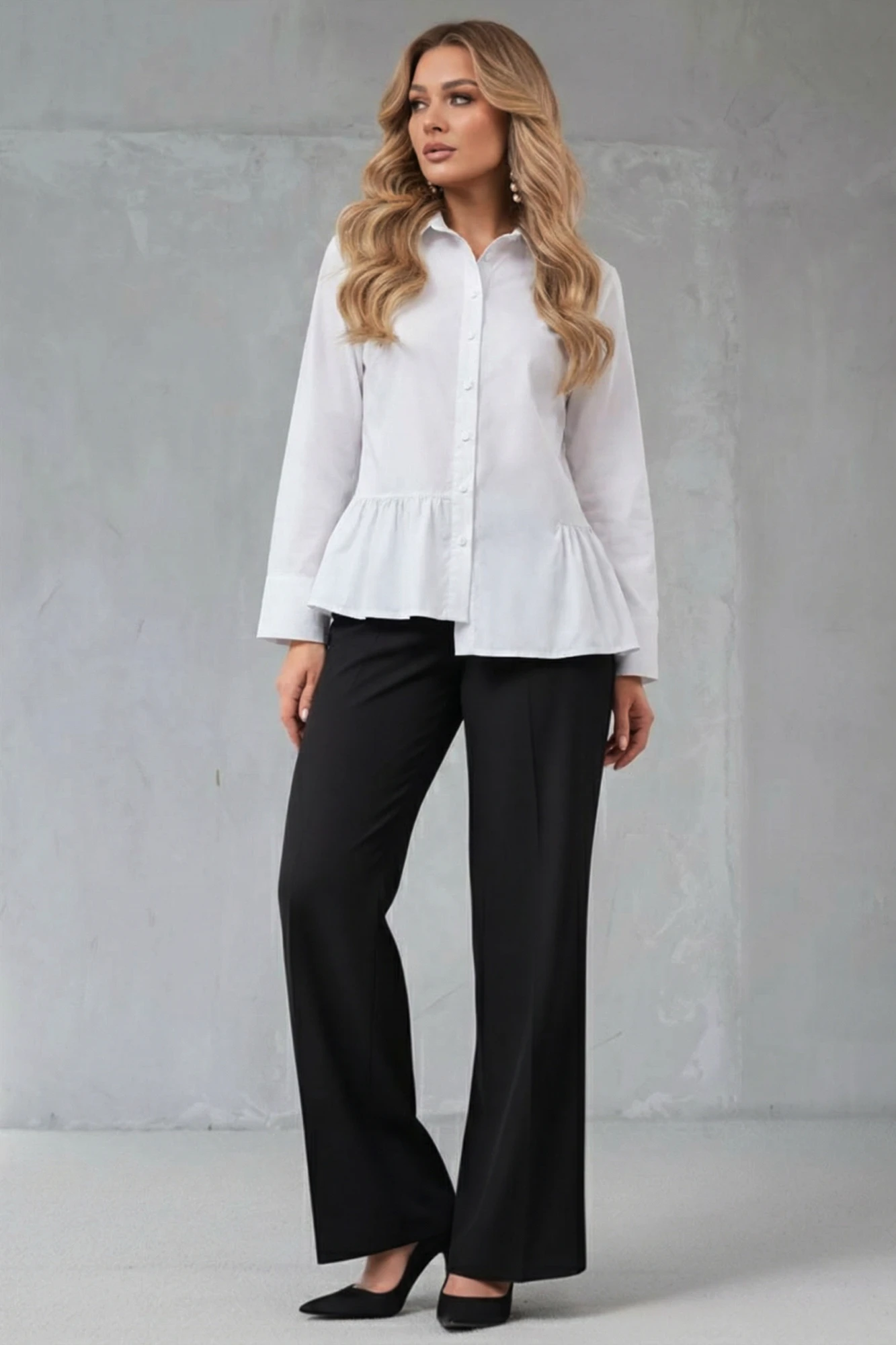 Низ: оформлен пеплумом (легкая оборка по линии низа), что добавляет объёма и женственности.