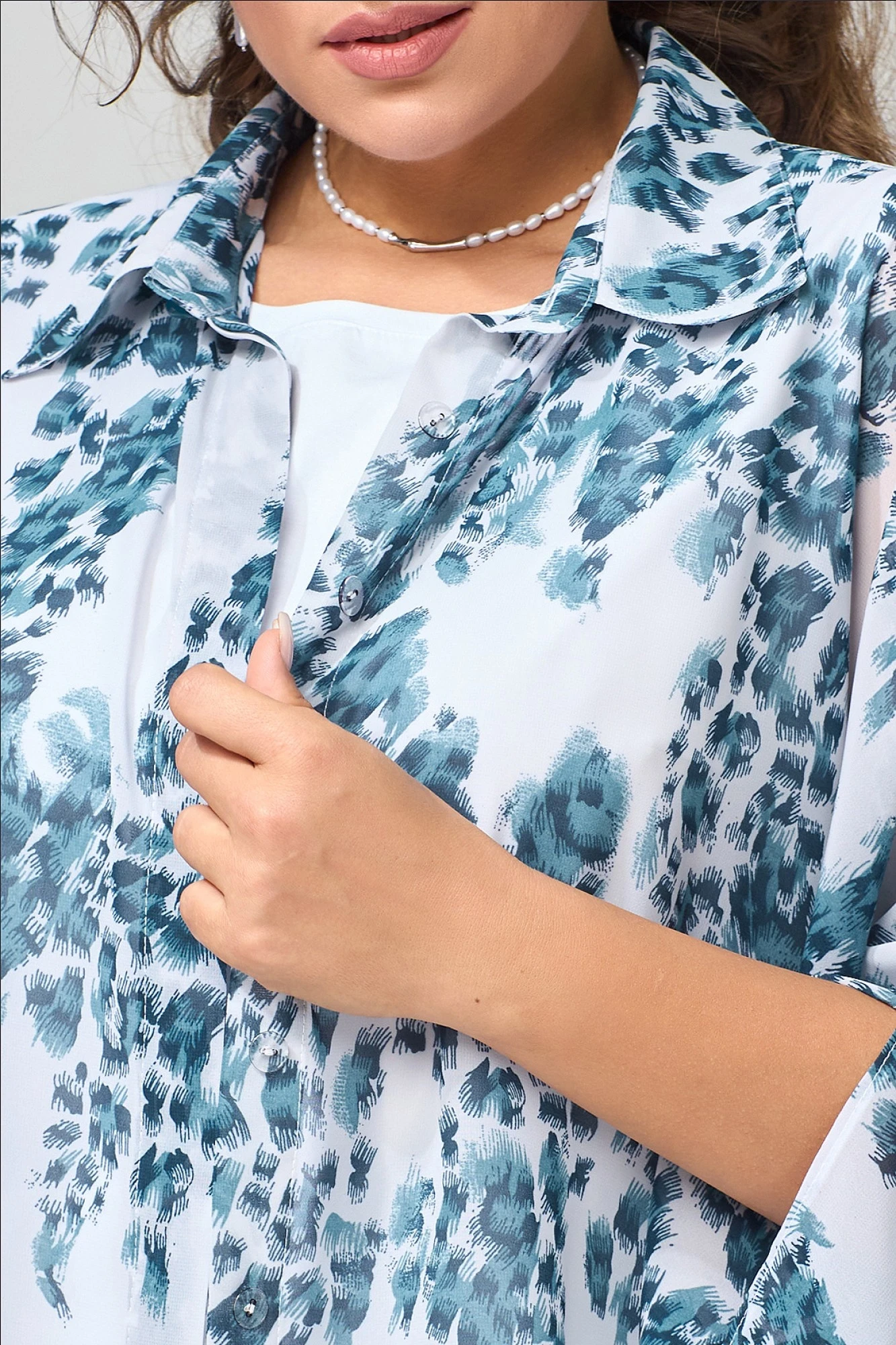 Комплект женский "Ветрана" двойка. Блузка расширенная к низу. Полочка на потайную застежку на петли и пуговицы. Воротник рубашечного типа на стойке. Низ обработан швом в подгибку. Топ прямого силуэта с выточкой по груди. Горловина и пройма обработаны планкой, низ в подгибку.