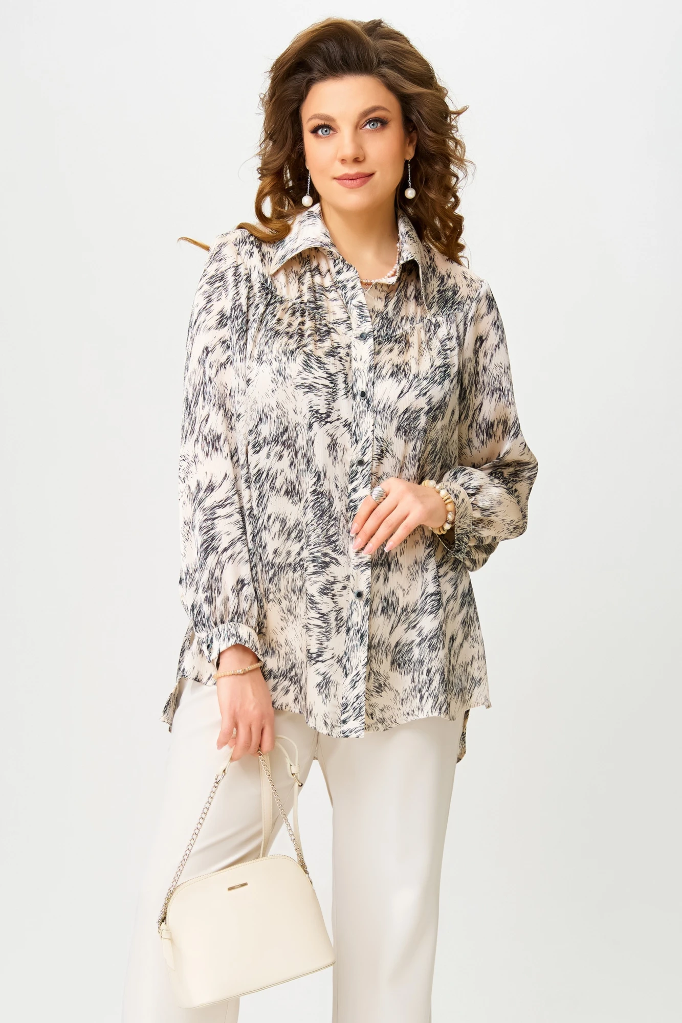 Женская блузка "Хариса" выполнена из текстильной ткани. Блузка прямого силуэта. Воротник отложной рубашечного типа на стойке, застежка на петли и пуговицы, планка отрезная. По спинке блузки кокетка, рукав в блузке втачной, по низку рукава манжет с застежкой на петлю и пуговицы. По полочке сборка и отрезная кокетка. Низ изделия обработан швом в подгибку с открытым срезом. В боковых швах блузки - разрезы.