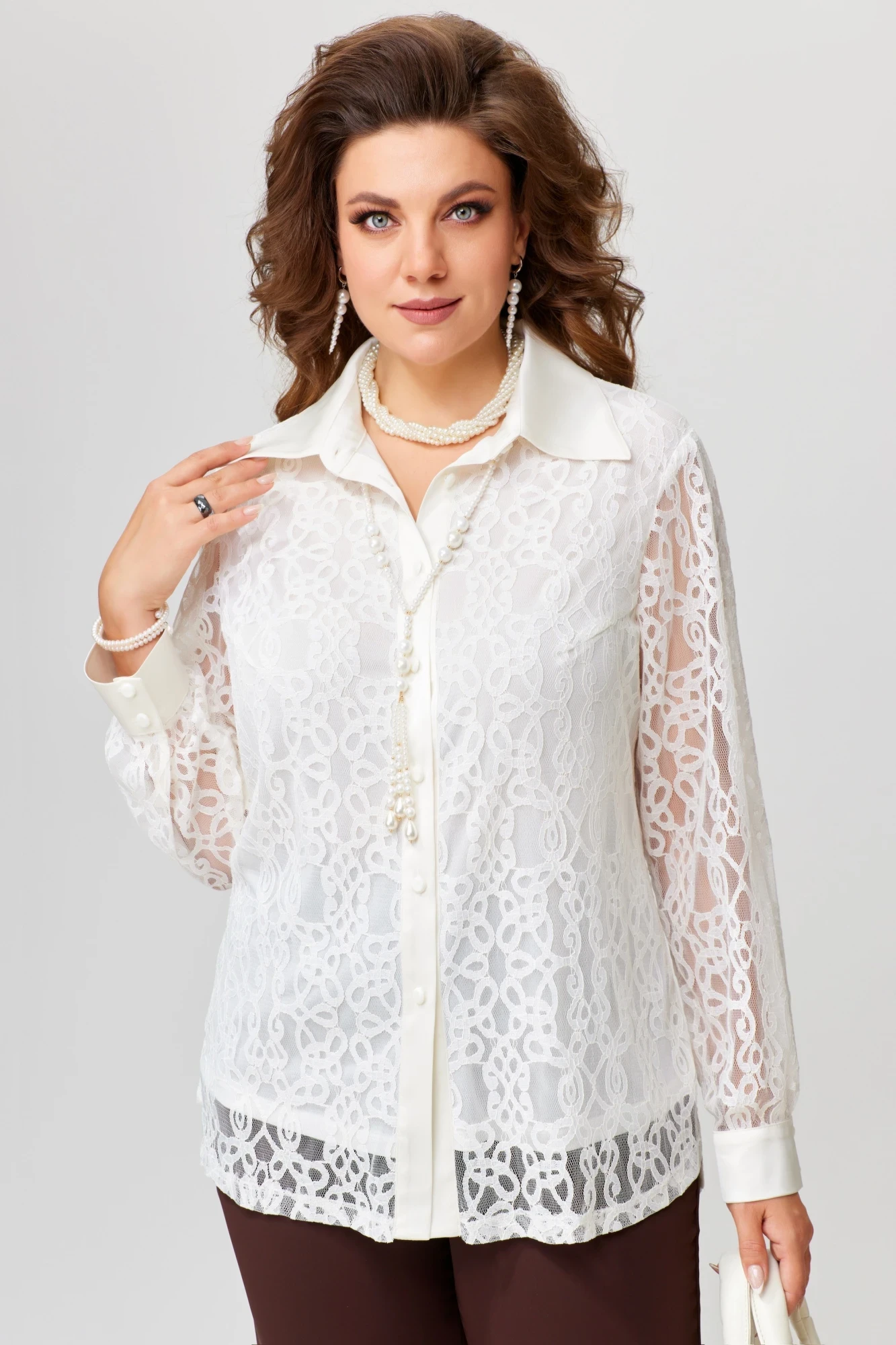 Женская блузка "ЮТА" из легкой нежной кружевной ткани, на трикотажной подкладке. Блузка прямого силуэта, по полочке нагрудная выточка из проймы. Рукав втачной, по низу рукава манжет на петлю и пуговицу. Застежка обработана отрезной планкой из атласной ткани на петли и пуговицы. Воротник в блузке из атласной ткани, рубашечного типа на стойке. Низ блузки обработан на распошивалку. Нарядная и эффектная блузка подойдет как наряд на свадьбу, день рождения, новый год.