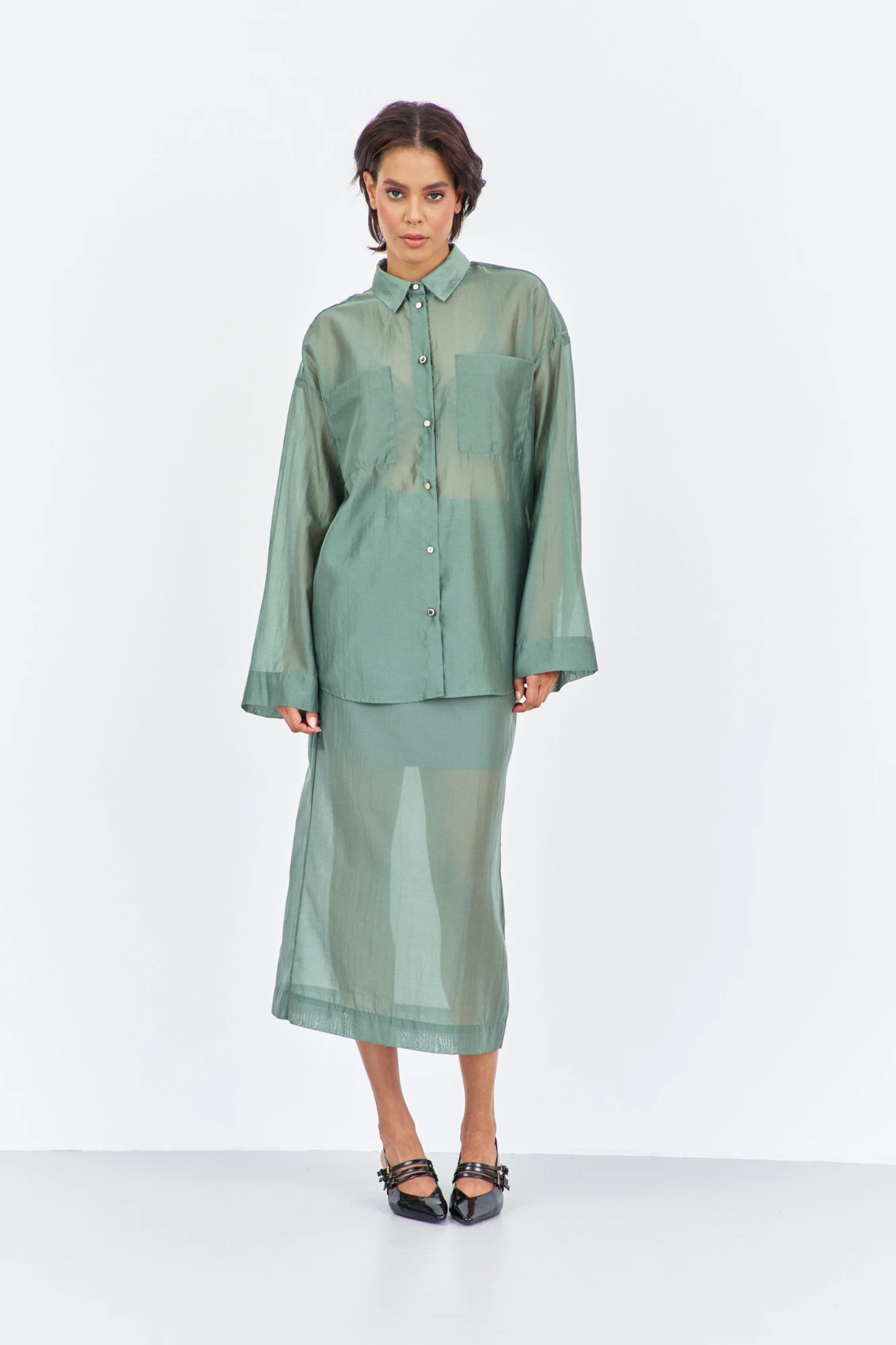 Блузка свободного силуэта с декоративными карманами по переду. Характеристики: выполнена из блузочной ткани в цвете зеленый мох, центральная застежка на петли и пуговицы, по переду карманы, по спинке отрезная кокетка. Длина рубашки по переду 79 см, длина рукава 53 см.