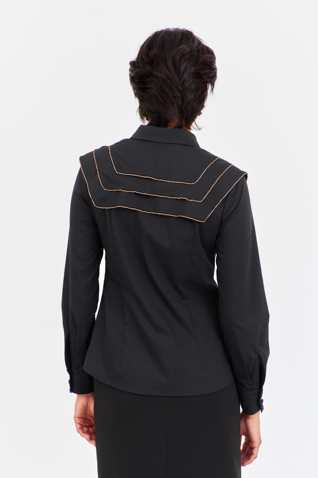 Блузка приталенного силуэта с декоративными кокетками. Характеристики: выполнена из блузочной ткани в черном цвете, центральная застежка на петли и пуговицы, по переду и спинке декоративные отлетные кокетки, низ рукава обработан манжетой. Длина рубашки по переду 66 см, длина рукава 61 см.