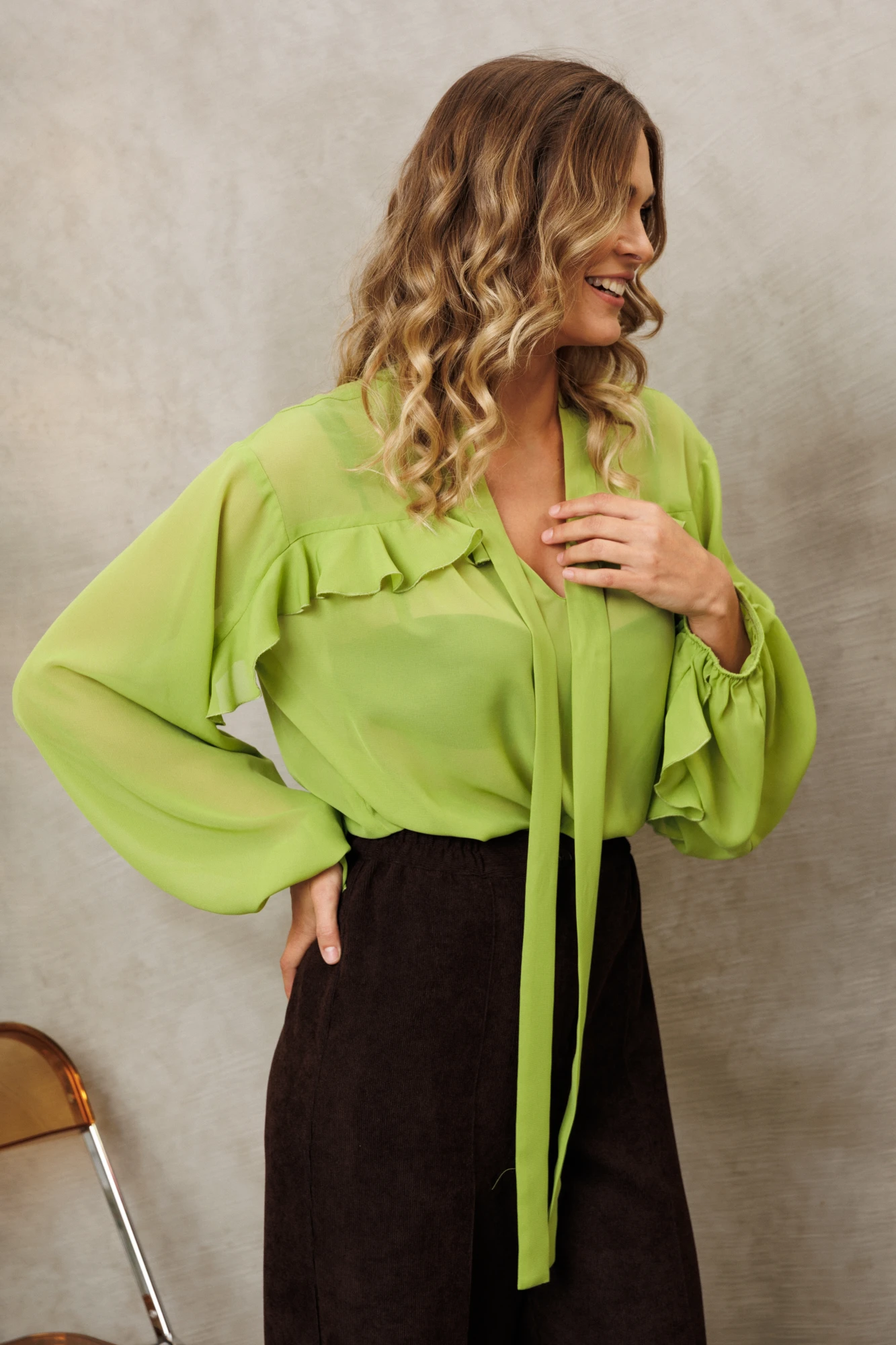 Блузка свободного силуэта из струящейся шифоновой ткани. Перед и спинка с кокеткой и сборкой. Рукав спущенный свободный с резинкой понизу. Вдоль линии кокетки и рукава вставлена рюша. Горловина V-образной формы с воротником стойкой переходящей в бант. Длина блузки - 67 см, длина рукава - 60 см.