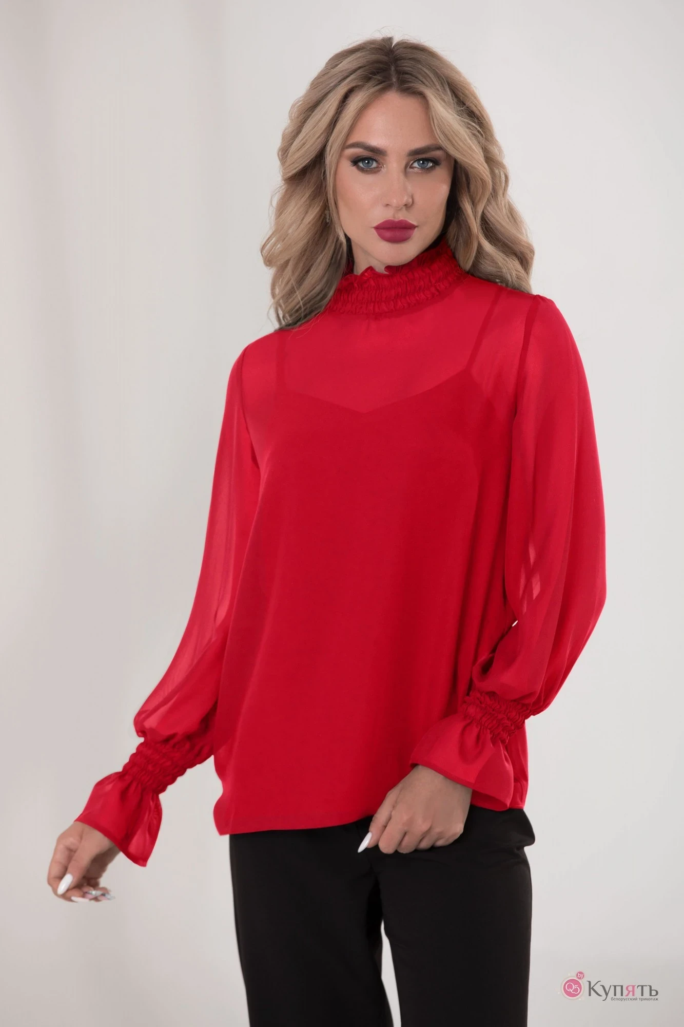 блузка с застежкой на навесные петли и пуговицы по стойке спинки. Отрезная стойка присборена венгеркой. Спинка цельная, с разрезом- капелькой по горловине. Манжета рукава присборена венгеркой. В комплекте с блузкой топ на бретелях.