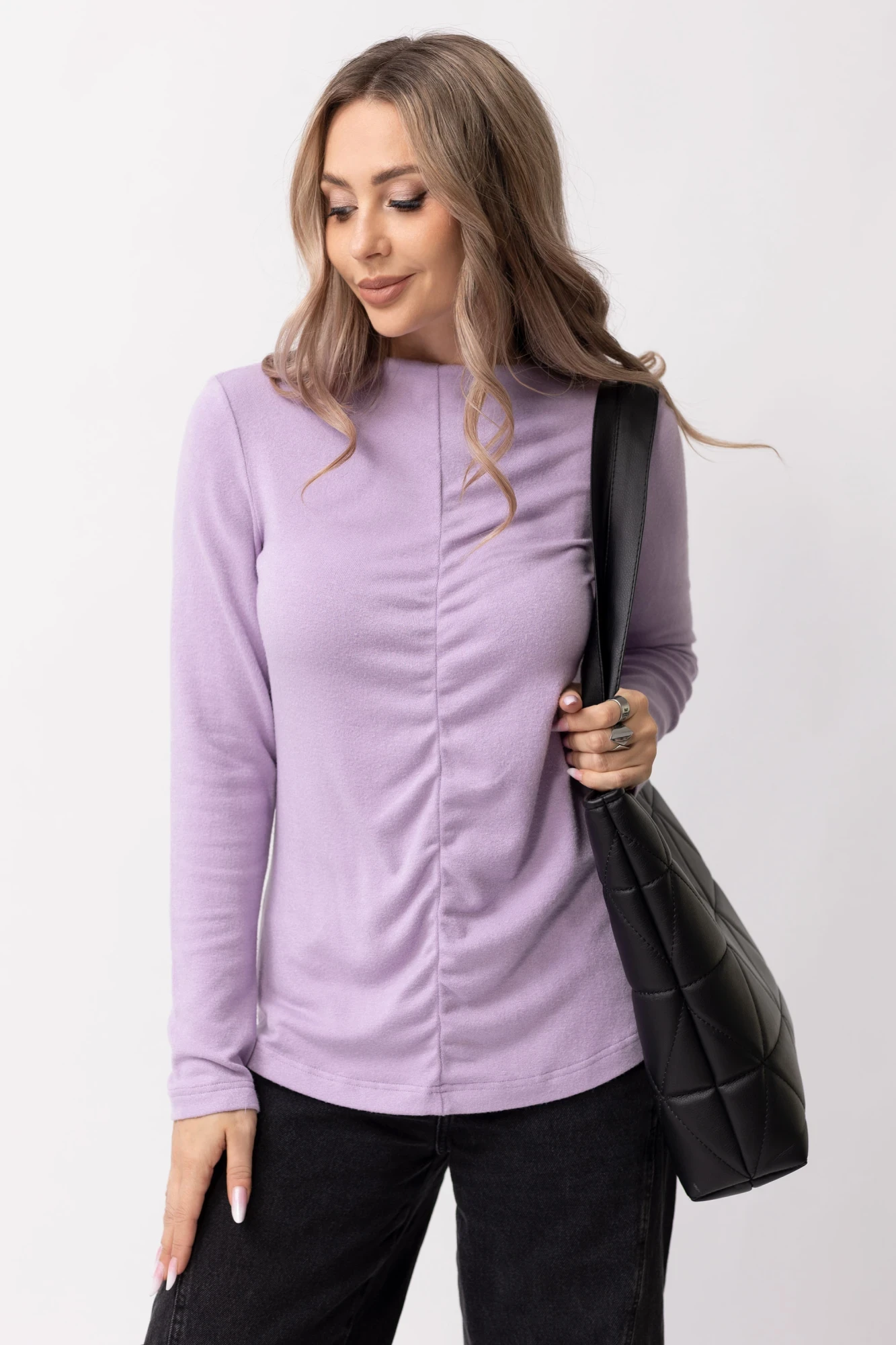 блузон с вырезом горловины- лодочка. По центру переда- шов, присборенный на резинку. Рукав длинный, втачной. Спинка цельная.