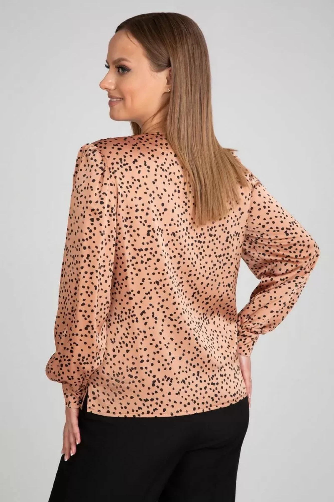 Женственная блузка прямого силуэта. Модель выполнена из легкой струящейся ткани - креп-сатин с набивными рисунками, которая практически не мнется. V-образный вырез горловины, центральная застежка на петли и декоративные пуговицы-полубусины. Передние полочки с легкой сборкой по плечевым швам. Аккуратные рукава-фонарики сосборены по плечевым швам и по швам притачивания манжет. Манжеты застегиваются на две пуговицы-полубусины. Боковые швы заканчиваются невысокими разрезами.