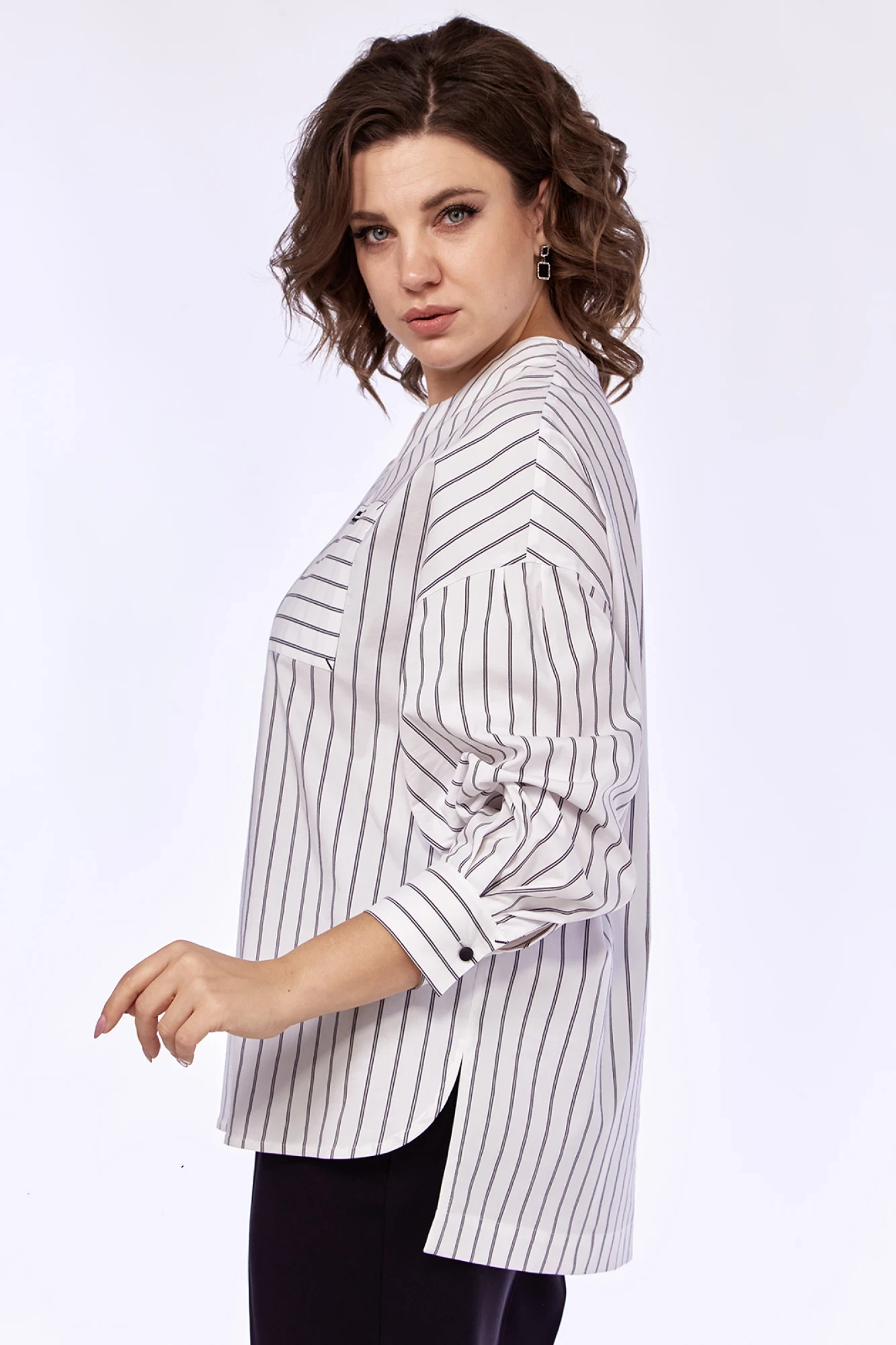 Блузка женская, повседневная. Выполнена из хлопчатобумажной ткани, свободного силуэта. Горловина фигурной формы. По переду нагрудный карман. Спинка цельная. Рукава спущенные, со складками по верхнему и нижнему срезу, на манжете с застежкой на одну петлю и пуговицу. Низ изделия фигурный, с перепадом длины.