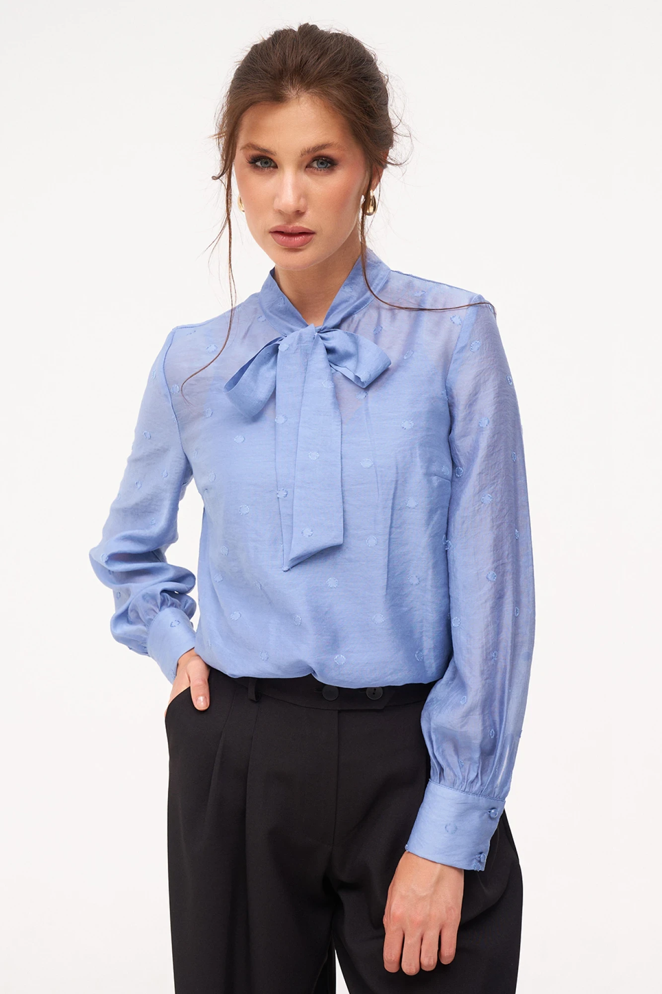 Классическая блузка прямого силуэта. Рукава на манжетах с застёжкой на пуговицы. По горловине стойка, переходящая в завязку для банта. В комплекте топ из хлопка.