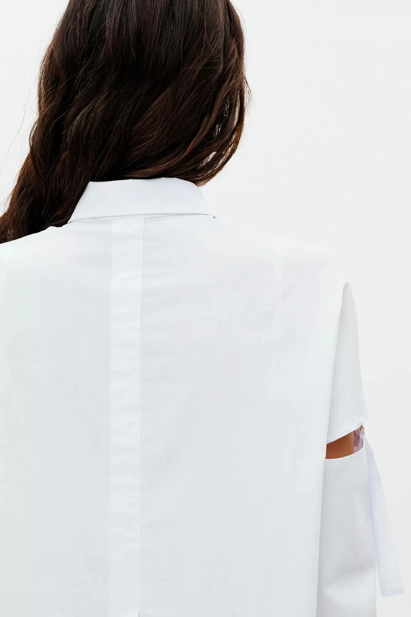 Блузка прямого силуэта. застежка по переду на пуговицы. По спинке высокий разрез. Рукава с разрезами, между которыми вставлены золотые полукольца. Эта блузка для тех кто устал от базовых белых рубашек, ее можно носить как в сочетании с простыми брюками, так и с джинсами под кроссовки.