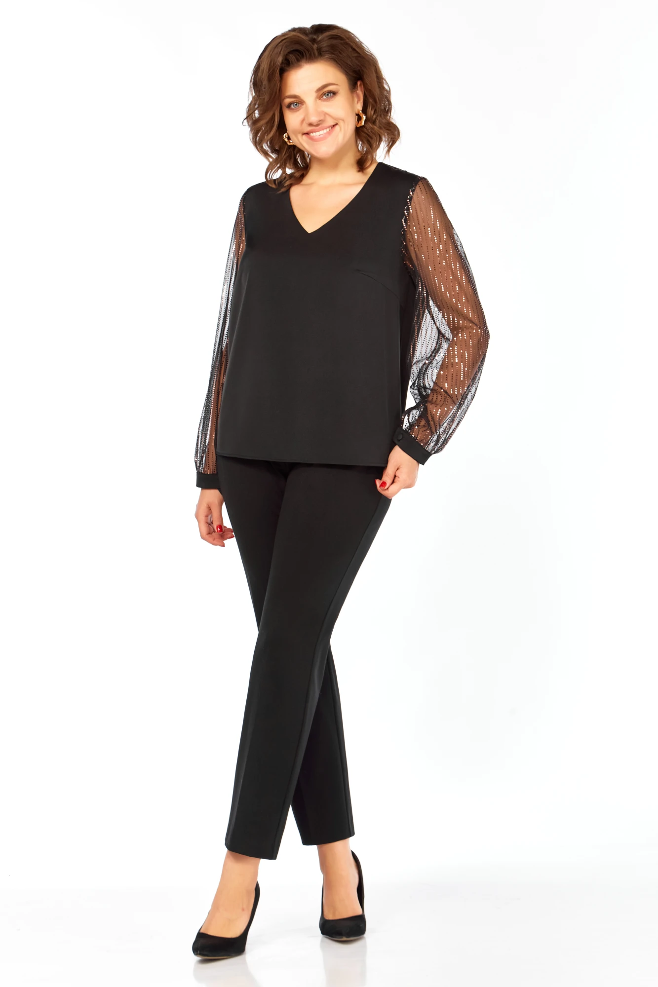 Блузка нарядная выполнена из пластичной шелковистой ткани с легким атласным блеском, рукава – из прозрачной сетки с пайетками. Блуза прямого силуэта с нагрудными вытачками, вырез горловины углубленный, рукав длинный, притачная манжета с пуговицей