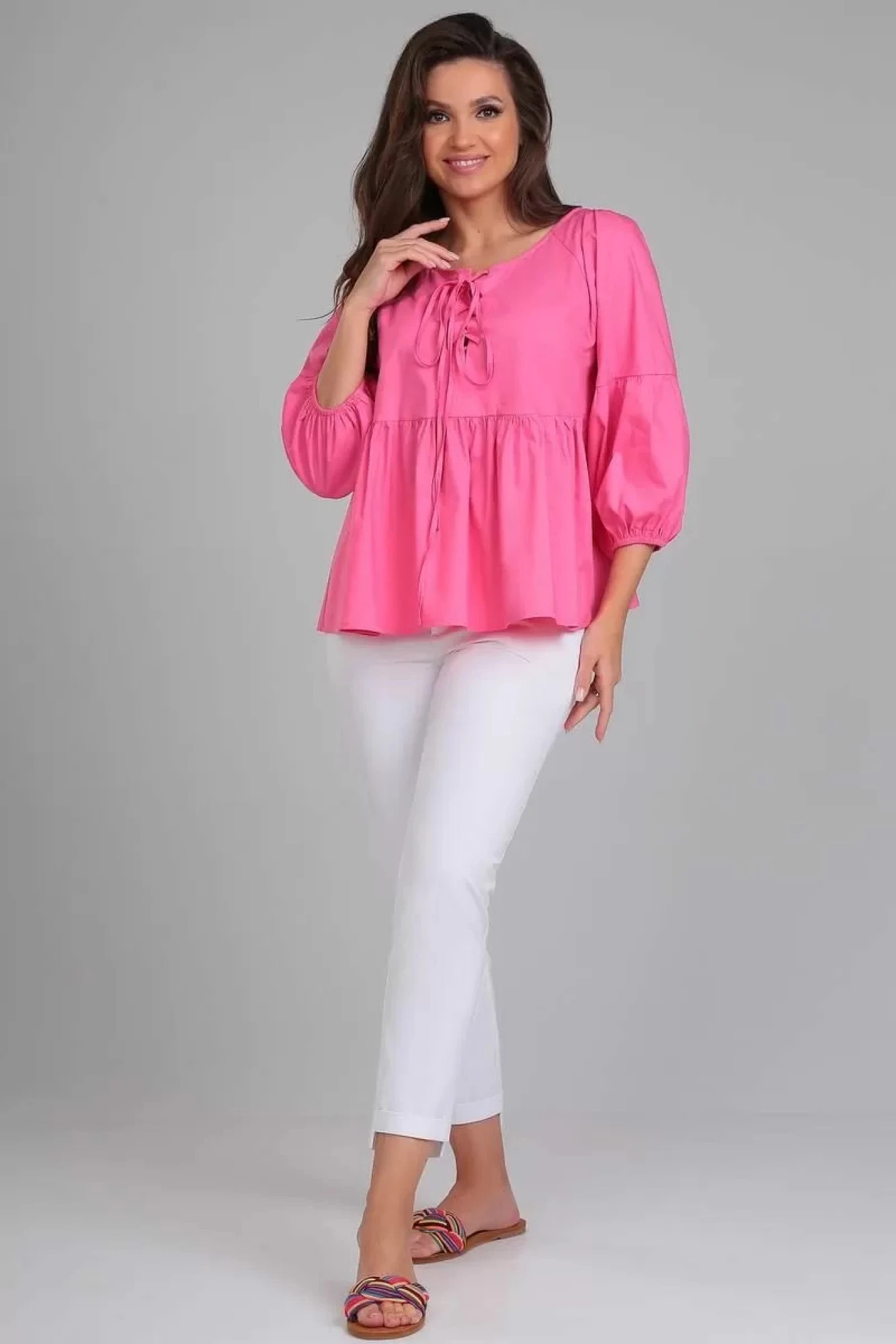 Блузка А-образного силуэта с подрезом ниже линии груди. Нижняя часть блузки со сборкой. Горловина круглой формы. В области горловины декоративный элемент в виде разреза с завязками. Рукав реглан укороченный с горизонтальным подрезом. Нижняя часть рукава со сборкой по верхнему и нижнему срезам. Рукав в области горловины с декоративной сборкой.