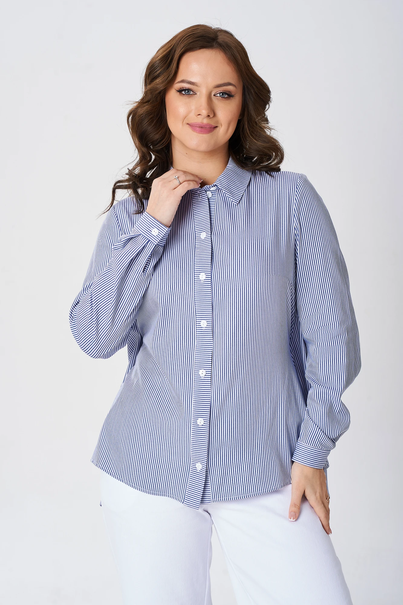 Блузка прямого силуэта с центральной застежкой на петли и пуговицы. Воротник рубашечного типа на отрезной стойке. Рукава втачные длинные на притачной манжете с застежкой на петлю и пуговицу. Спинка с отрезной кокеткой и нижней притачной фигурной деталью. По спинке блузка фиксируется поясом, что позволяет регулировать прилегание.