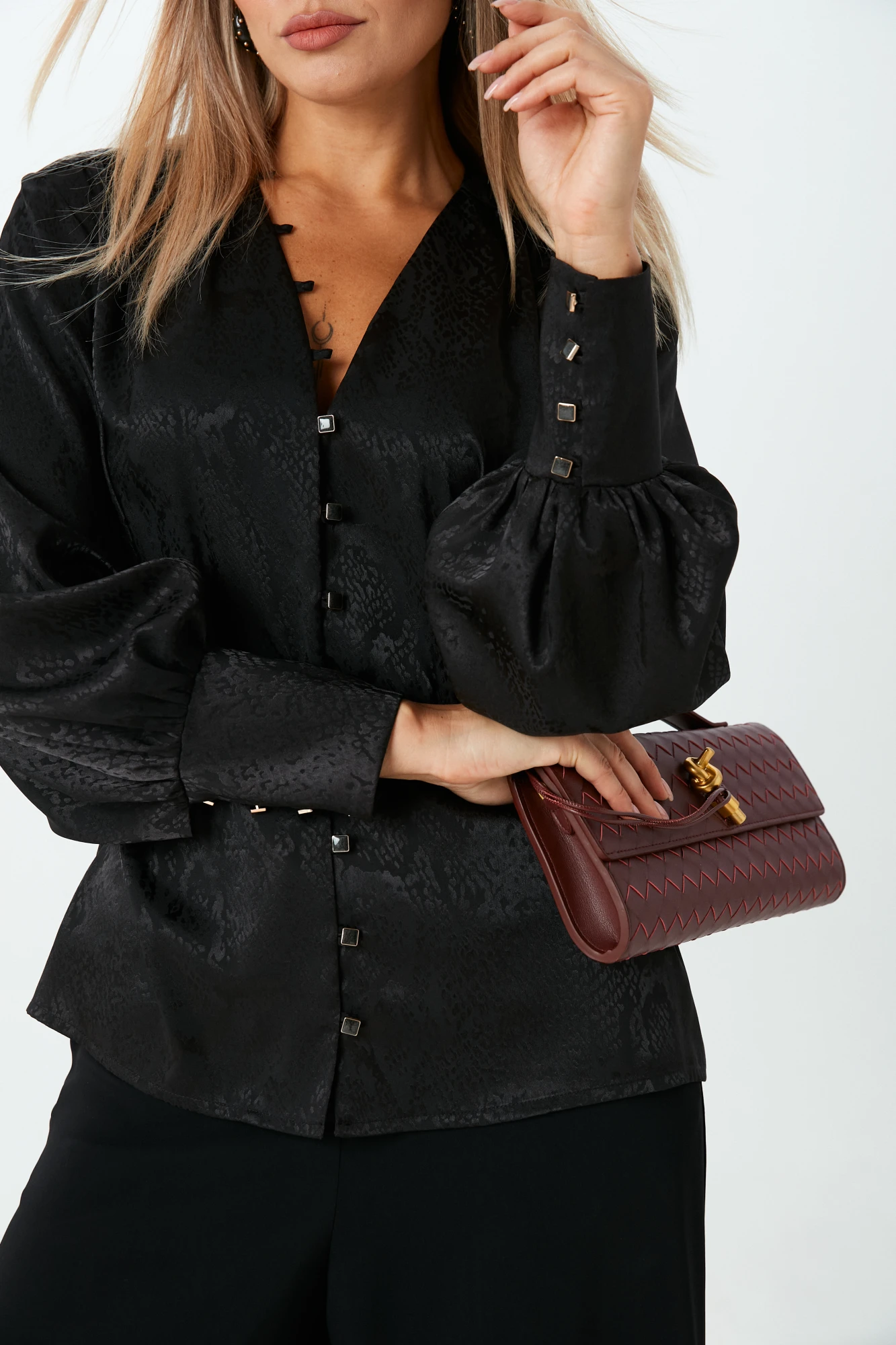 Блуза из тонкой ткани с атласным эффектом, свободного силуэта с V-образным вырезом. Это довольно глубокий вырез, который прекрасно подчёркивает декольте и линию шеи. Застежка на навесные петли и пуговицы. Рукава длинные объёмные втачные заканчиваются широкой манжетой с застёжкой на навесные петли с пуговицами.