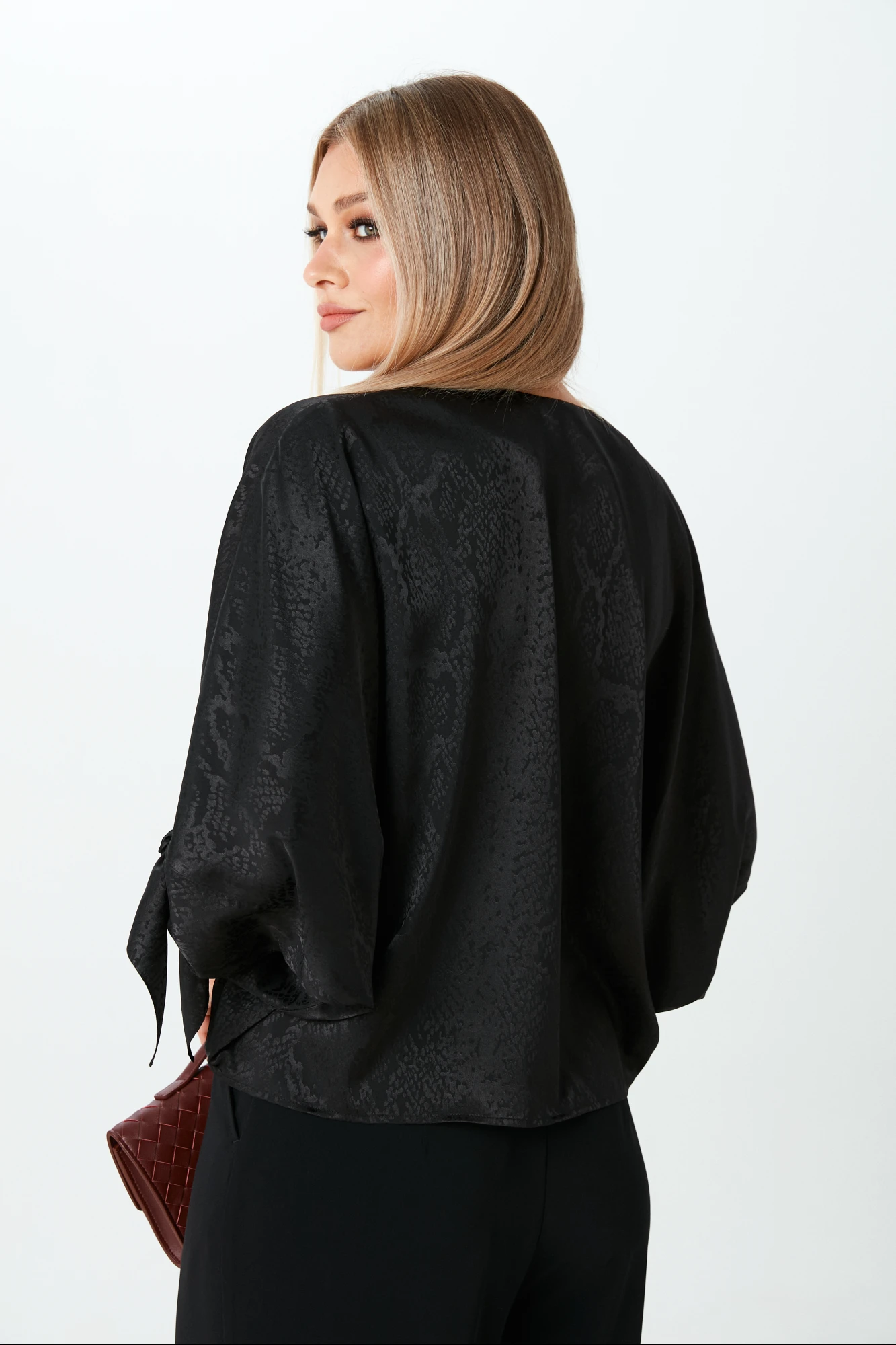 Укороченная блузка свободного силуэта с V- образной горловиной. Рукава цельнокроенные длинной ¾ . По низу рукавов оригинальные завязки. Низ блузки прямой.