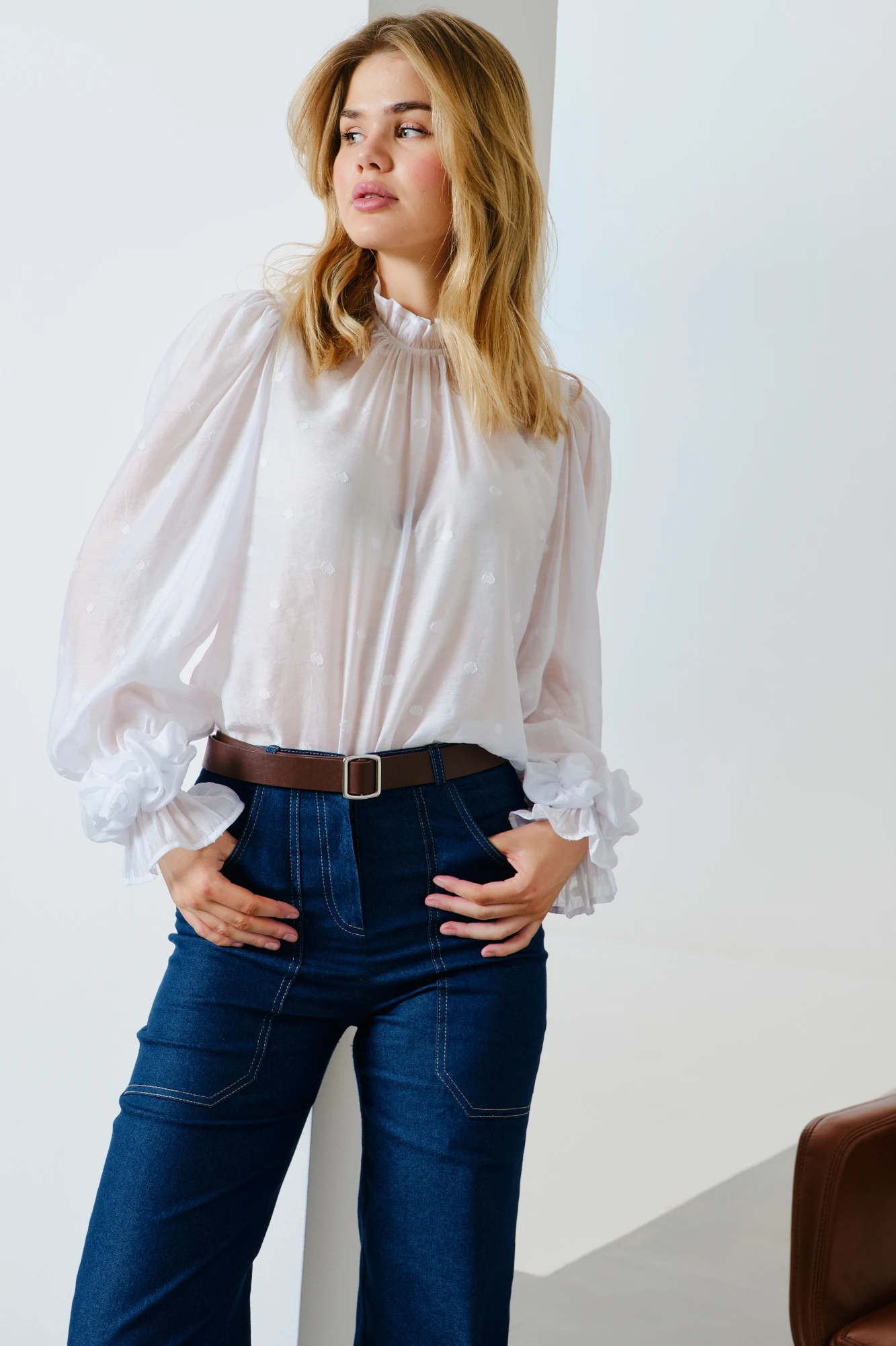 Блуза из нежной, струящейся вискозной ткани дизайн "горох". Рукав втачной, по верхней части рукава сборка, низ рукава собран на резинки, а также по низу прилагается дополнительный декор-цветы ручной работы на резинке, которые можно носить по желанию. По горловине рюша. По спинке средний шов переходящий в застёжку на навесную петлю и пуговицу.