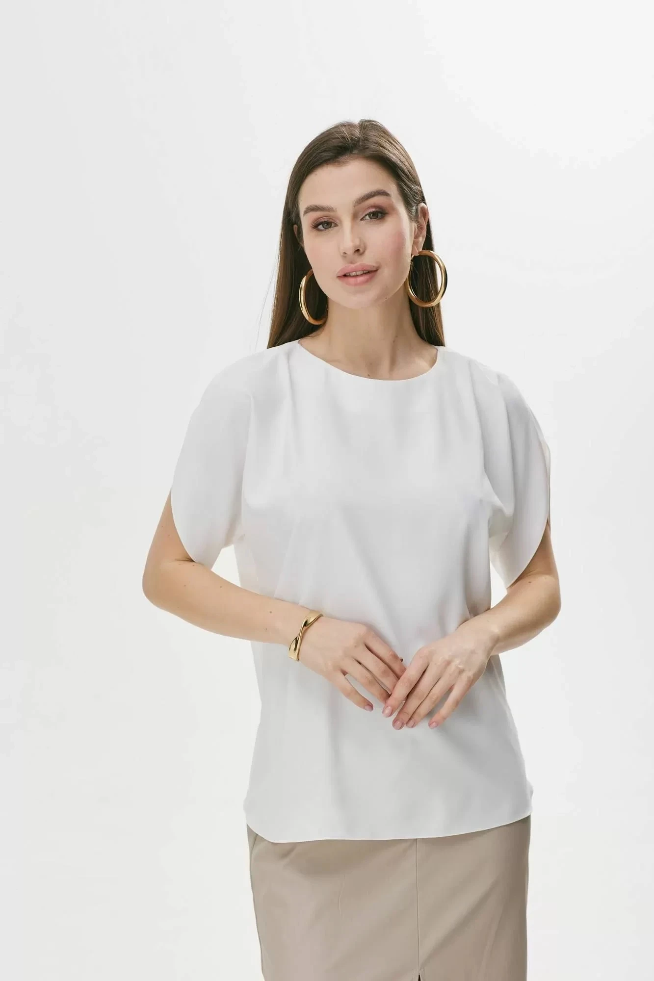 Нарядная блузка прямого силуэта с фигурным низом из струящейся ткани. Горловина округлая, на спинке разрез с застежкой на петлю и пуговицу. Рукав покроя летучая мышь с фигурным вырезом.