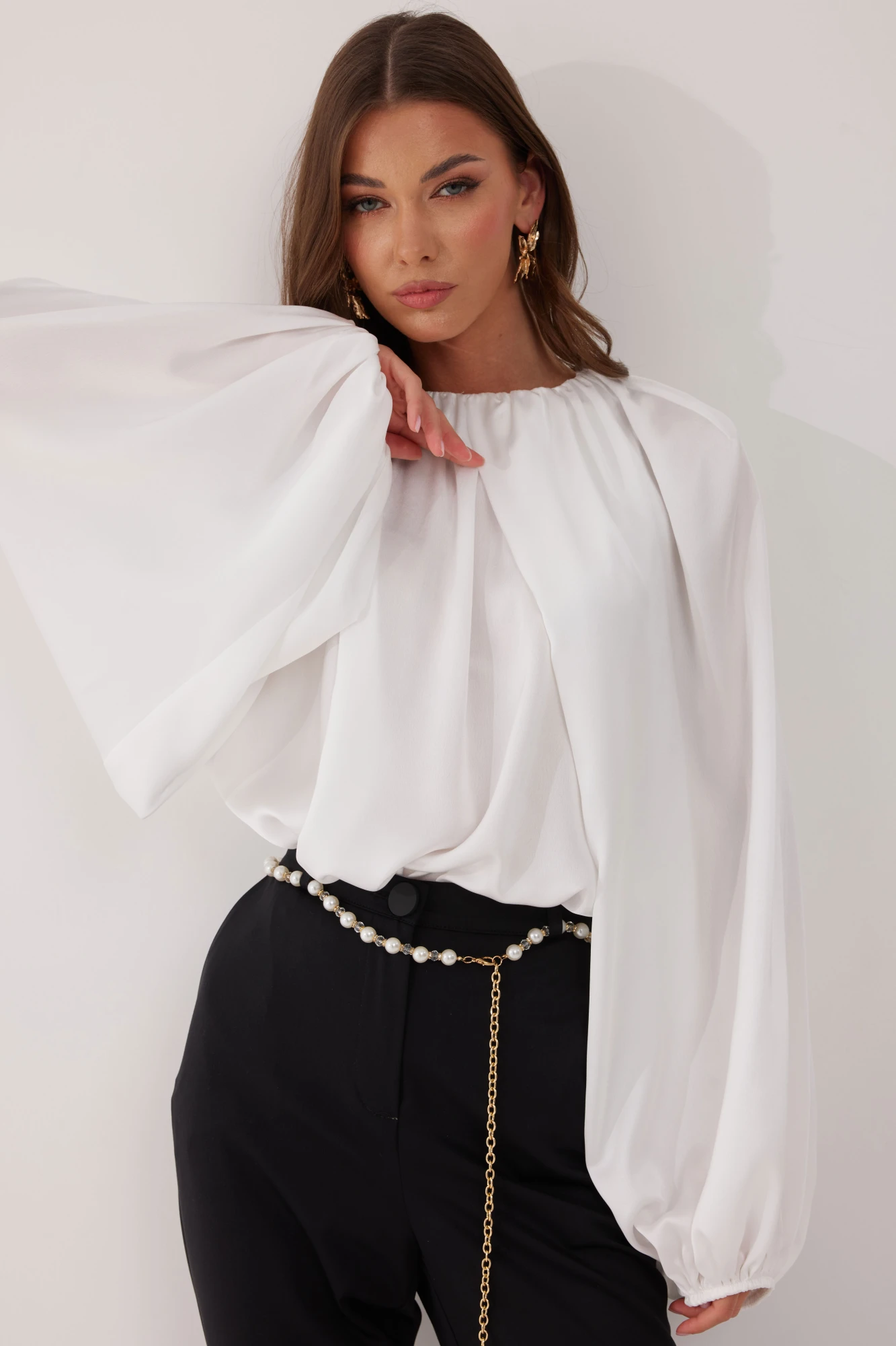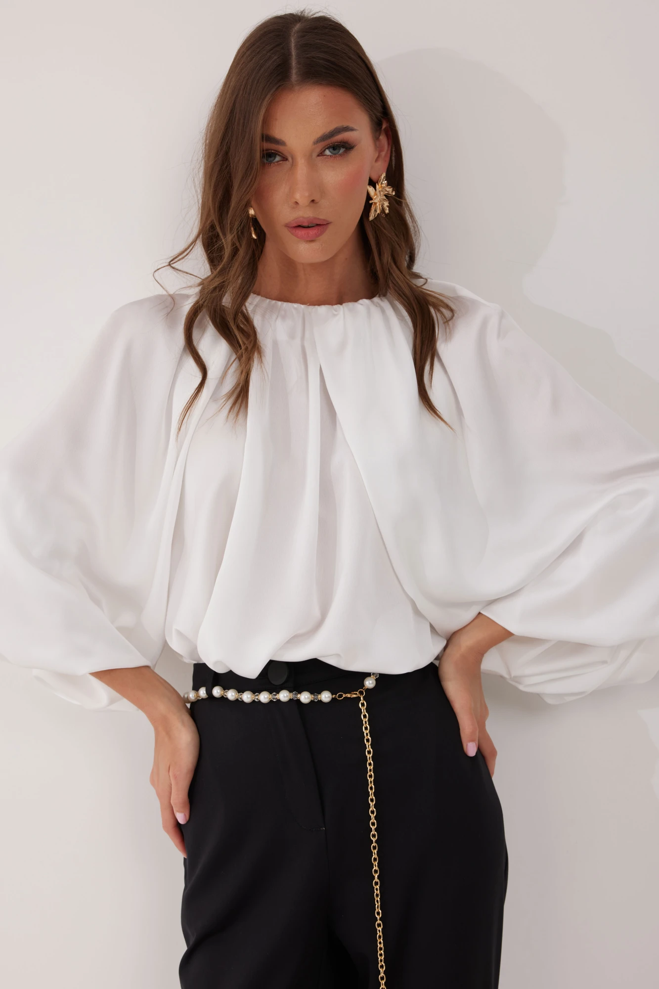 Стильная блуза прямого силуэта с акцентными рукавами. Горловина округлая, на спинке застежка на потайную молнию. По горловине сборка и декоративные складки. Рукав покроя реглан длинный и широкий, по низу собран на эластичную тесьму (резинку).