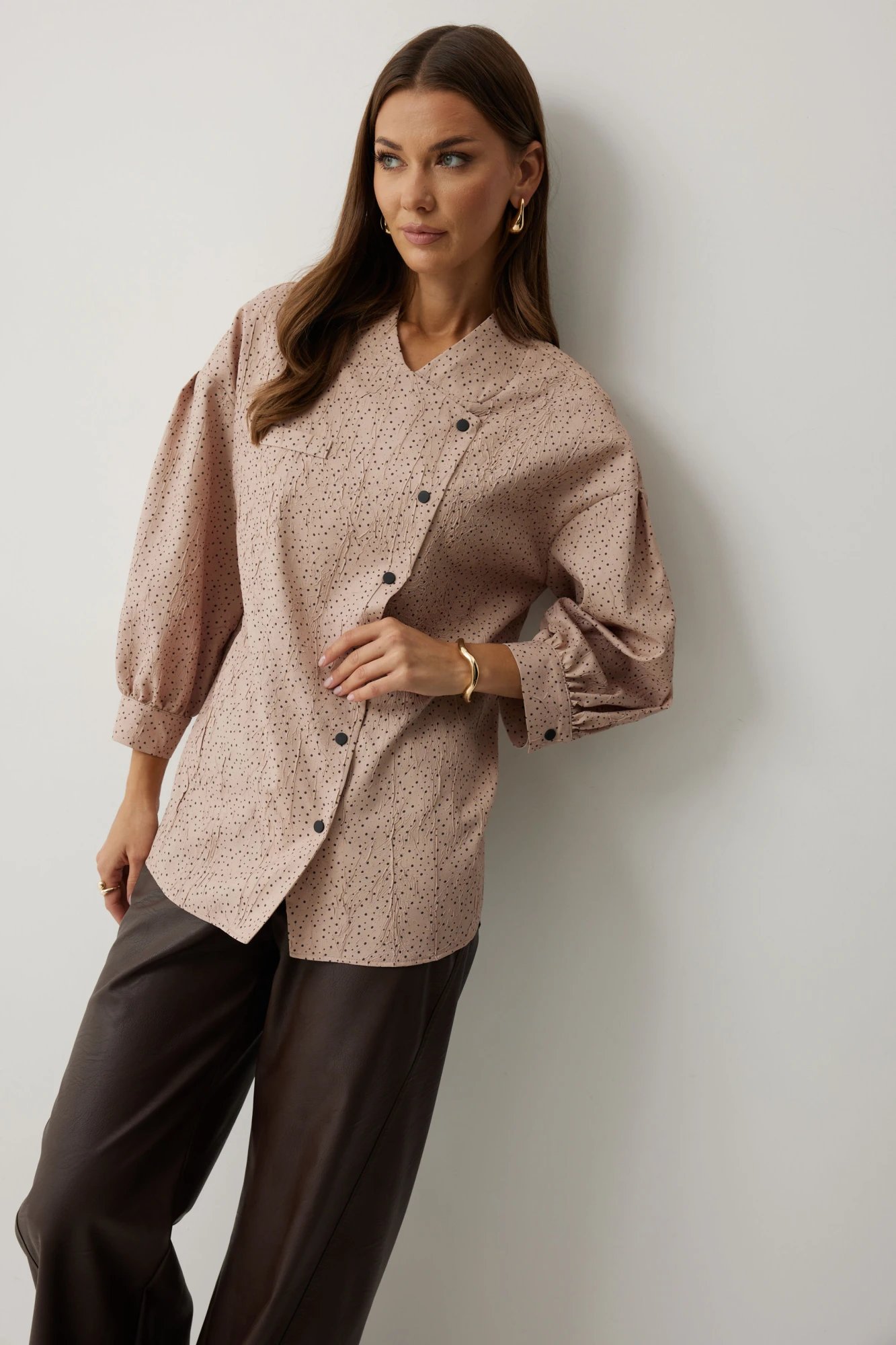 Ассиметричная блузка прямого силуэта. Низ фигурный. Рукав, спущенный с встречной складкой по центру. По низу манжета с застежкой на кнопку. По переду декоративная настрочная листочка. Ассиметричная двубортная застежка на кнопки. Воротник-стойка. Обращаем ваше внимание, что фурнитура может незначительно отличаться от фото.