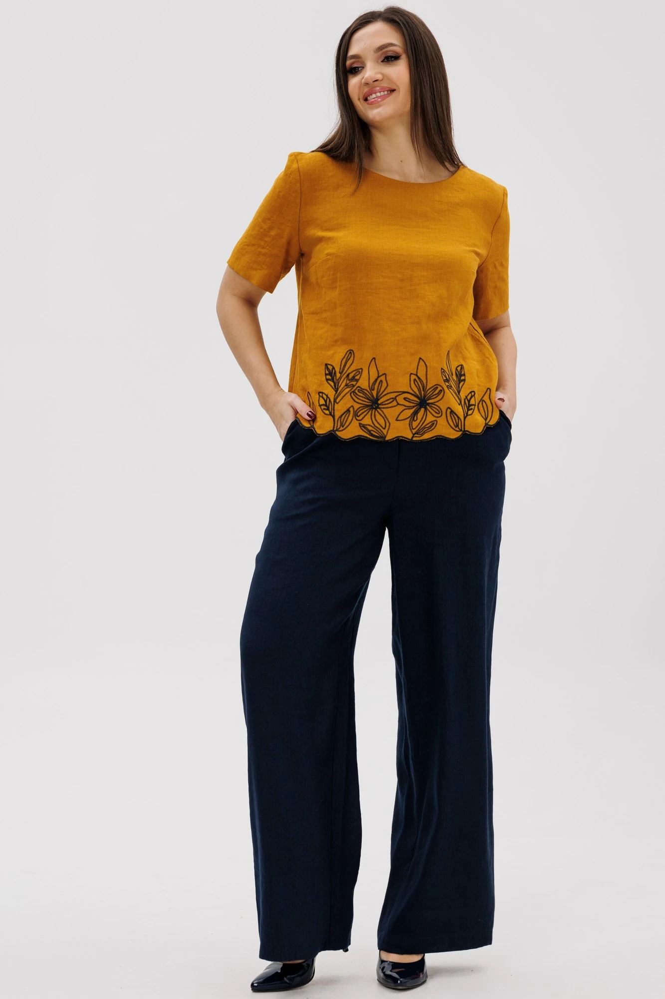 Блуза для летнего офиса и повседневного использования. Будет идеально смотреться с нашими льняными брюками 2086 (на фото), также обе модели можно приобрести комплектом 3128."