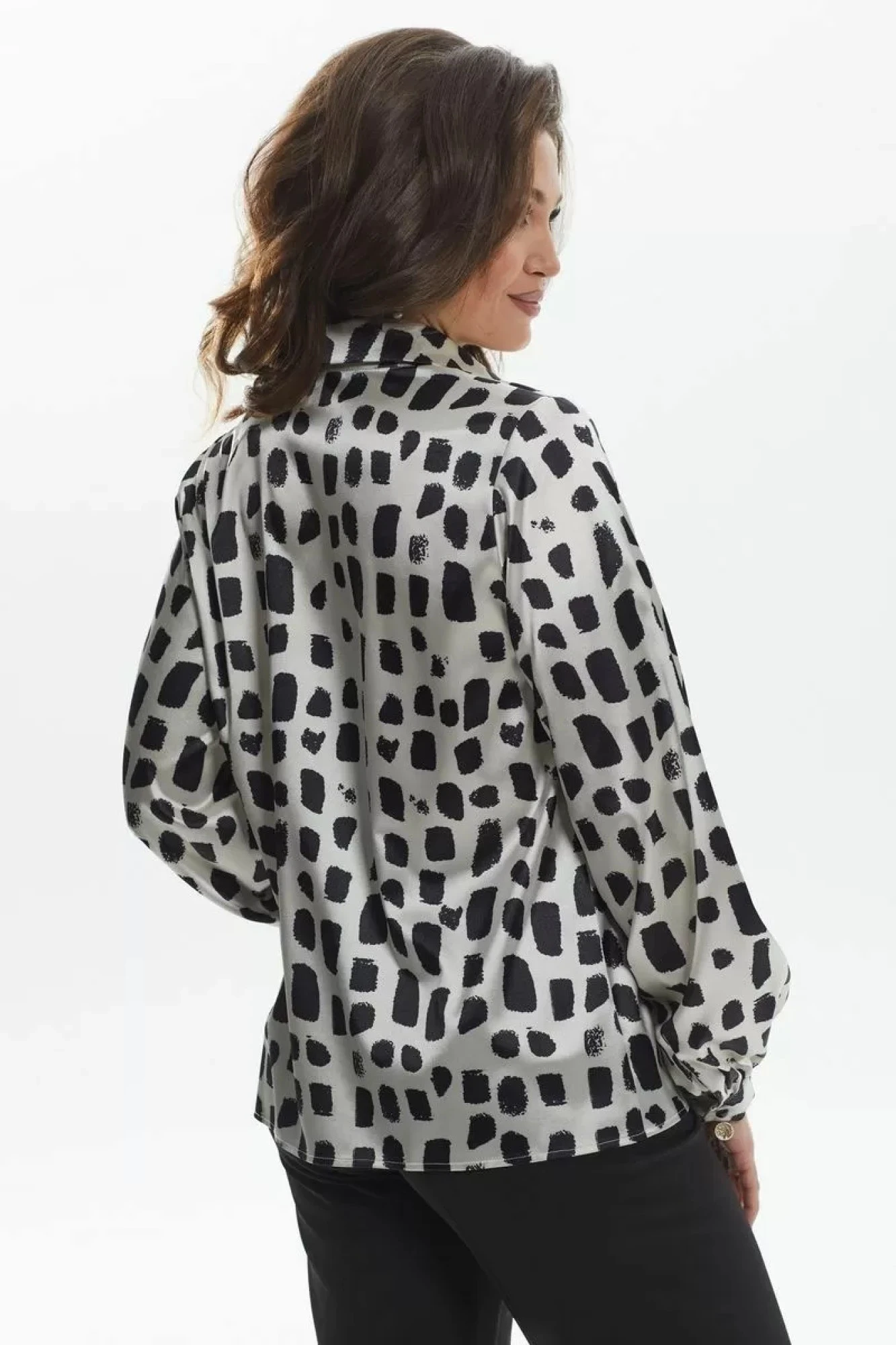 Блузка женская прямого силуэта на центральной застежке на петли и пуговицы. Перед с нагрудными вытачками от боковых швов. Спинка цельнокроеная. Рукав втачной одношовный длинный по низу со сборкой и на манжете, застегивающемся на петлю и пуговицу. Горловина на стойке с воротником