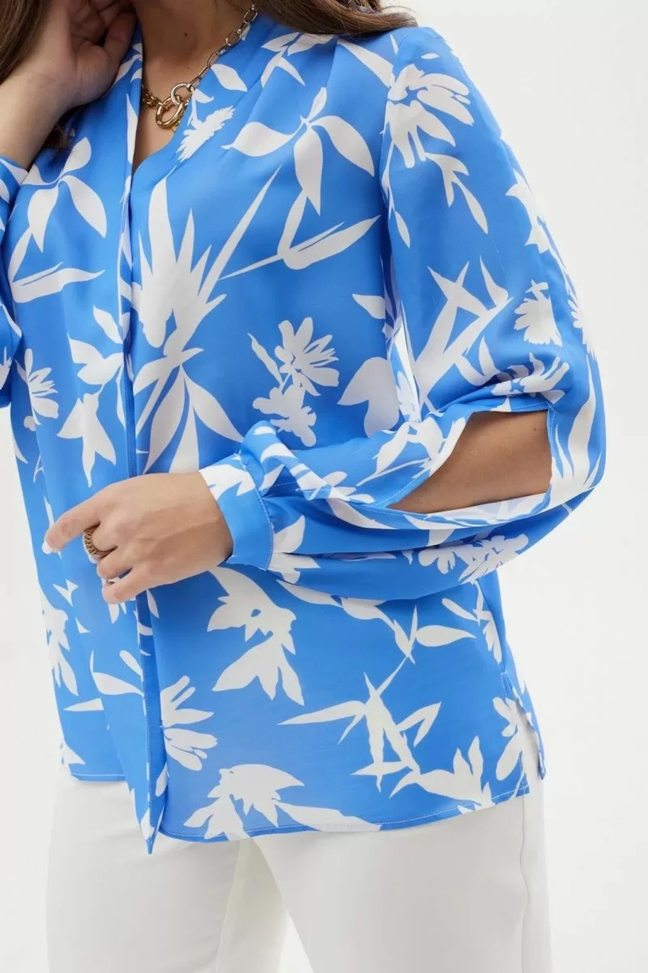 Блузка прямого силуэта. По плечам драпировка в виде двух застроченных складок. По центру переда имитация застежки. Рукав расширенный со встречными складками по низу.Манжет застегивается на одну пуговицу. В среднем шве рукава разрез до локтя. В боковых швах разрезы.