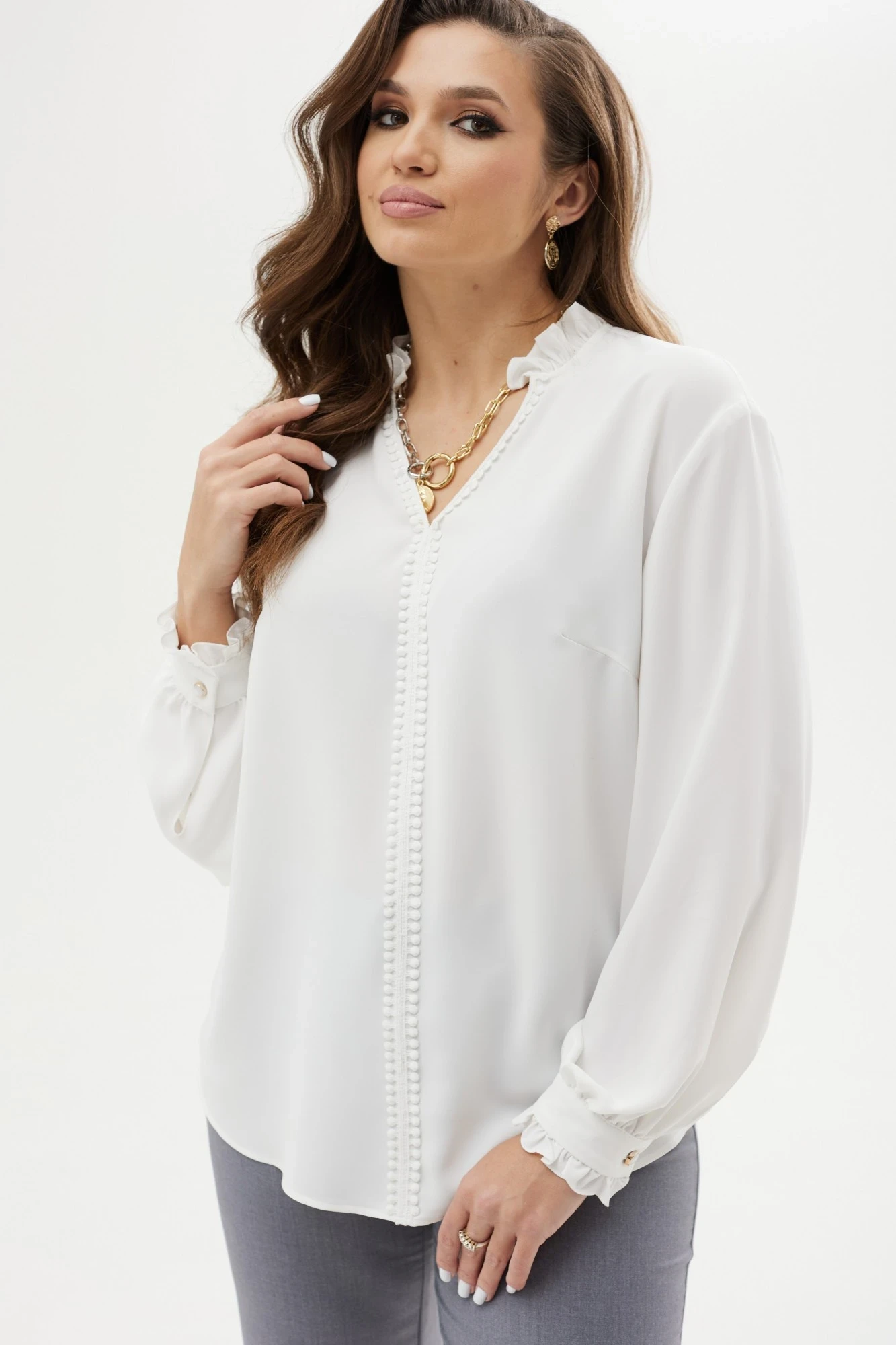Блуза прямого силуэта с фигурным низом. Плечо спущенное, рукав расширенный книзу со сборкой на манжете. Горловина V-образной формы. По горловине и по центру переда декоративная тесьма. В горловине и по низу манжеты рюша.