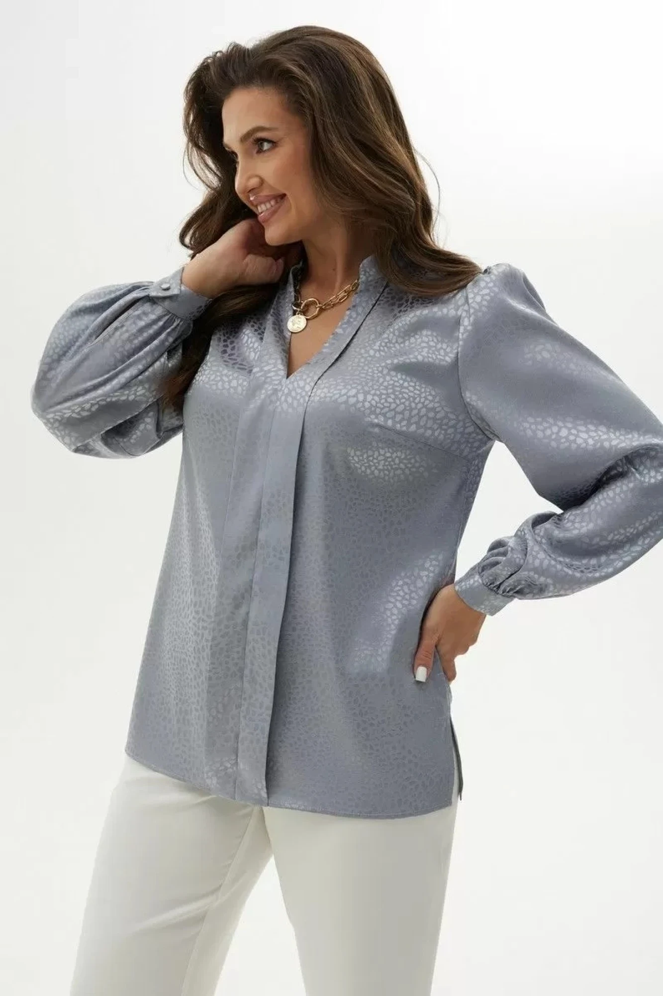 Блуза женская прямого силуэта. По переду притачные отлетные декоративные планки. V-образный вырез горловины. Воротник-стойка. Слегка укороченная линия плеча. По окату рукава сборка. С изнанки шва притачивания рукава - подокатник для усиления эффекта сборки оката. По низу рукава также сборка. Рукав застегивается на манжет с одной пуговицей. По боковым швам разрезы.