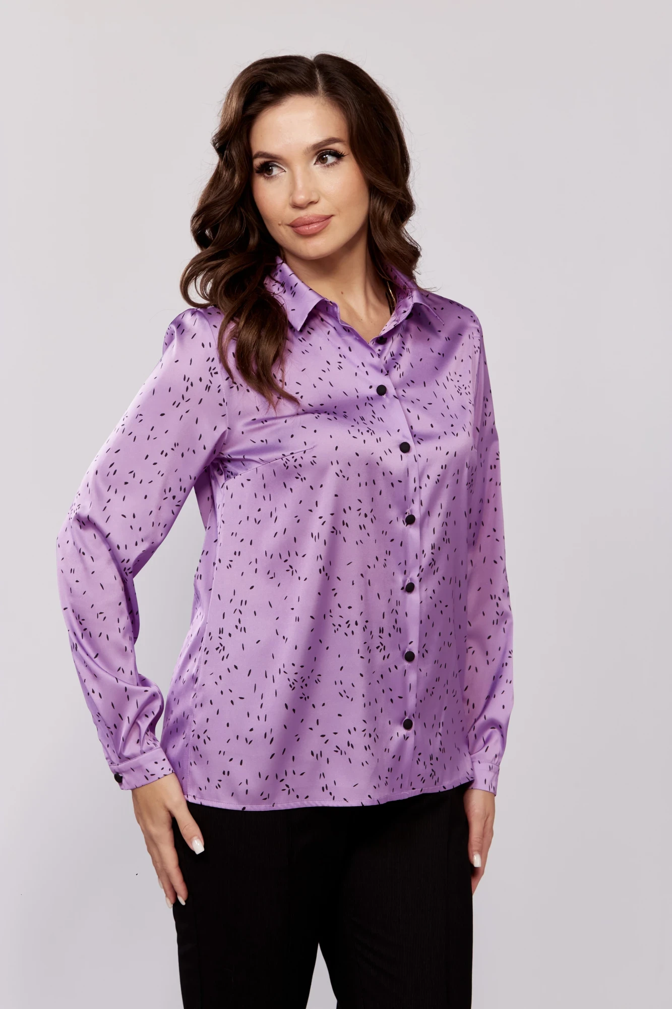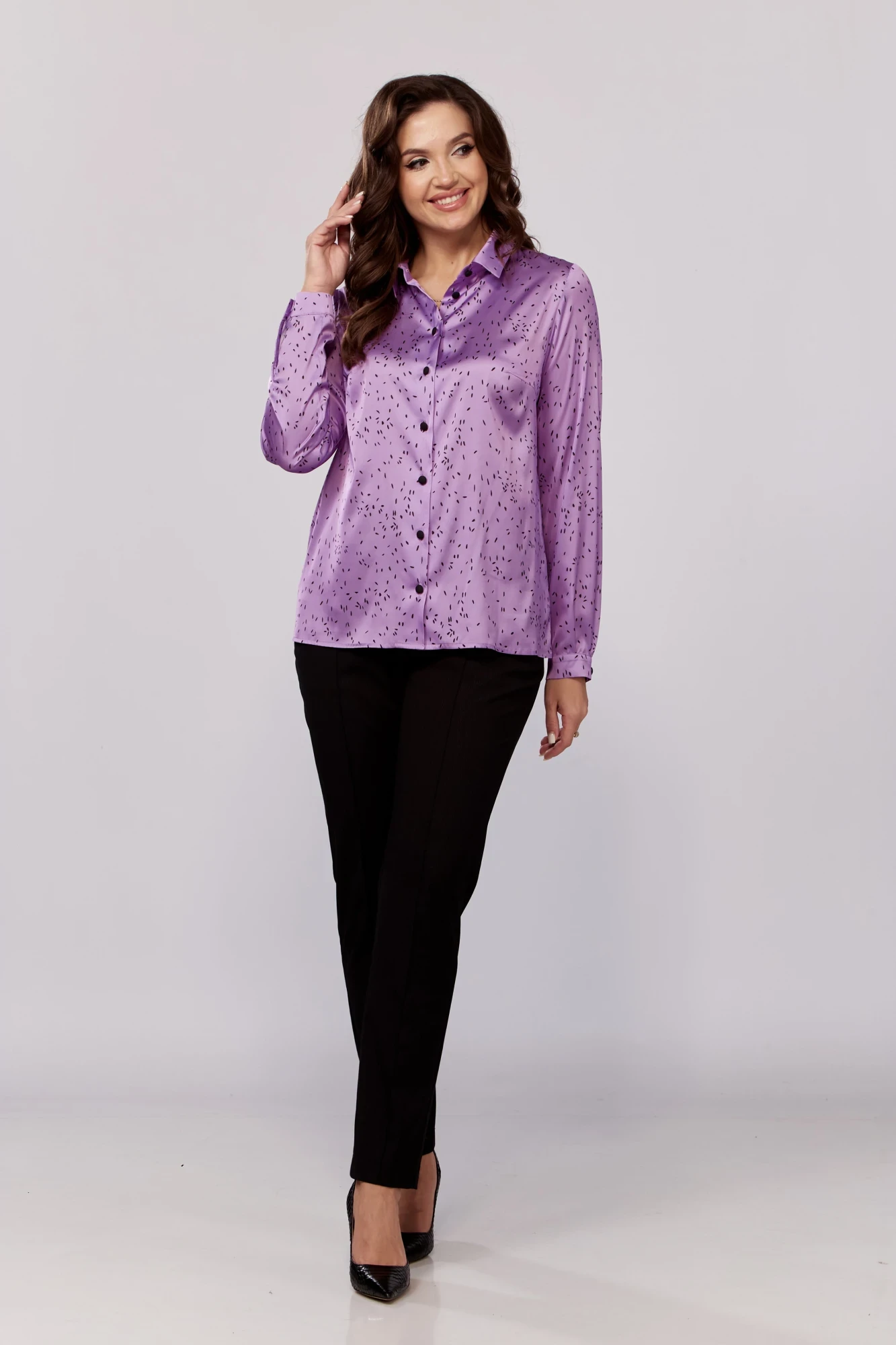 Блузка женская прямого силуэта на центральной застежке на петли и пуговицы. Перед с нагрудными вытачками от боковых швов. Спинка цельнокроеная. Рукав втачной одношовный длинный по низу со сборкой и на манжете, застегивающемся на петлю и пуговицу. Горловина на стойке с воротником