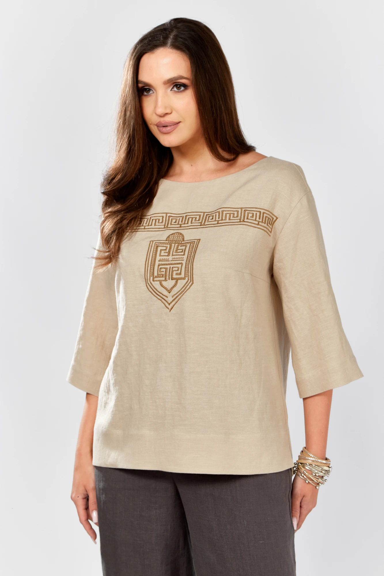 Блуза прямого силуэта. В боковых швах разрезы . Низ разноуровневый. По переду нагрудные вытачки и декоративная вышивка. Спинка со средним швом.Плечо немного спущено. Рукав рубашечного покроя , 3/4, слегка расширен к низу. Горловина "лодочка".