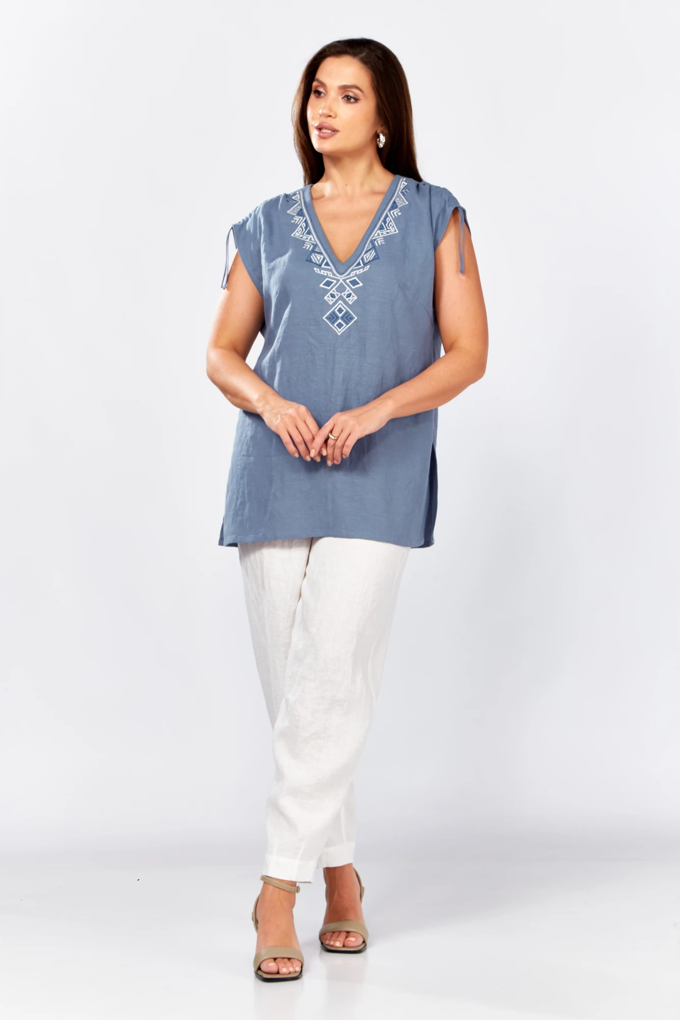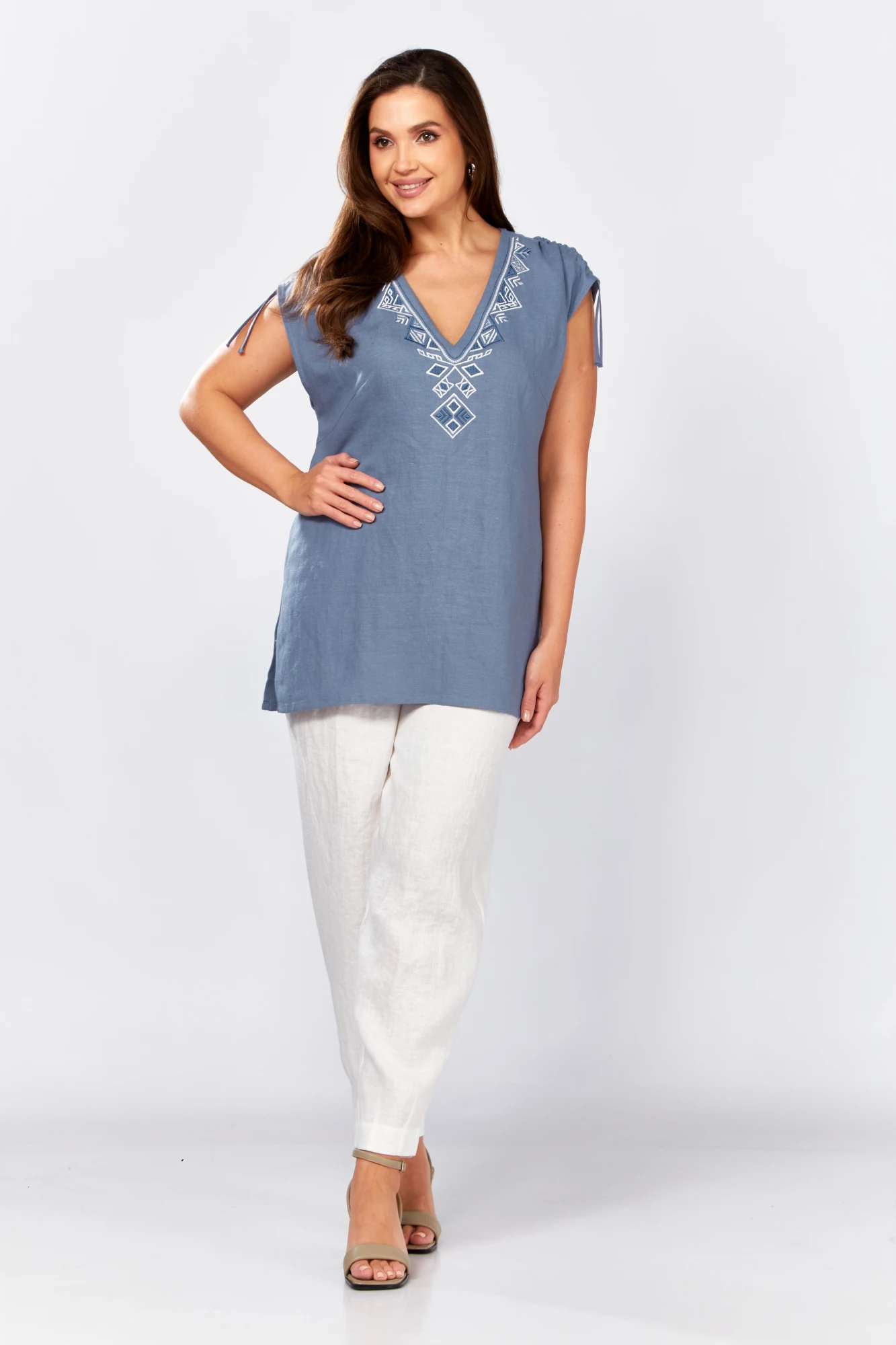 Блуза прямого силуэта. В боковых швах разрезы. Спинка со средним швом. По переду нагрудные вытачки. Горловина с V - образным вырезом , украшена декоративной вышивкой. По плечевому шву обработана кулиса с завязками из основной ткани .