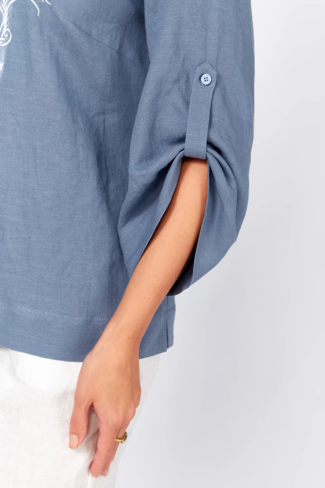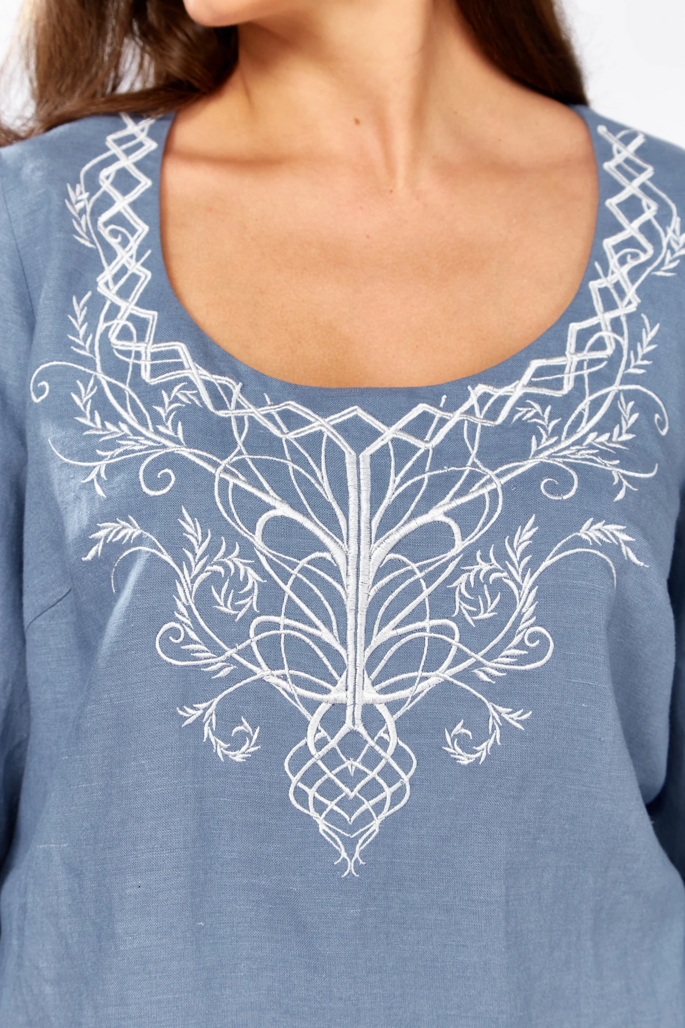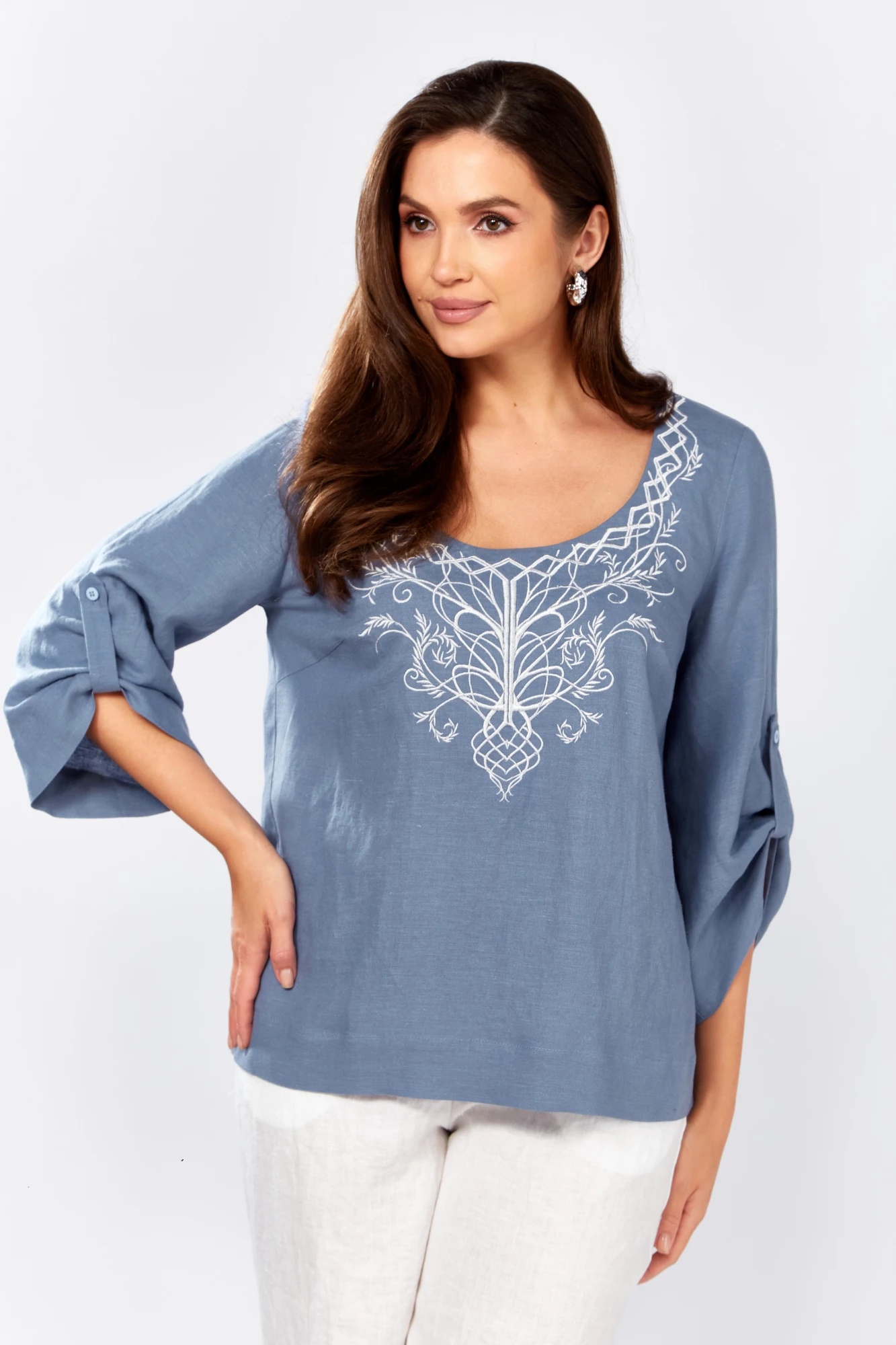 Блуза прямого силуэта. По переду нагрудные вытачки и декоративная вышивка. Горловина округлой формы. В боковых швах разрезы. Рукав втачной, расширен к низу, с застёжкой на пату и пуговицу.