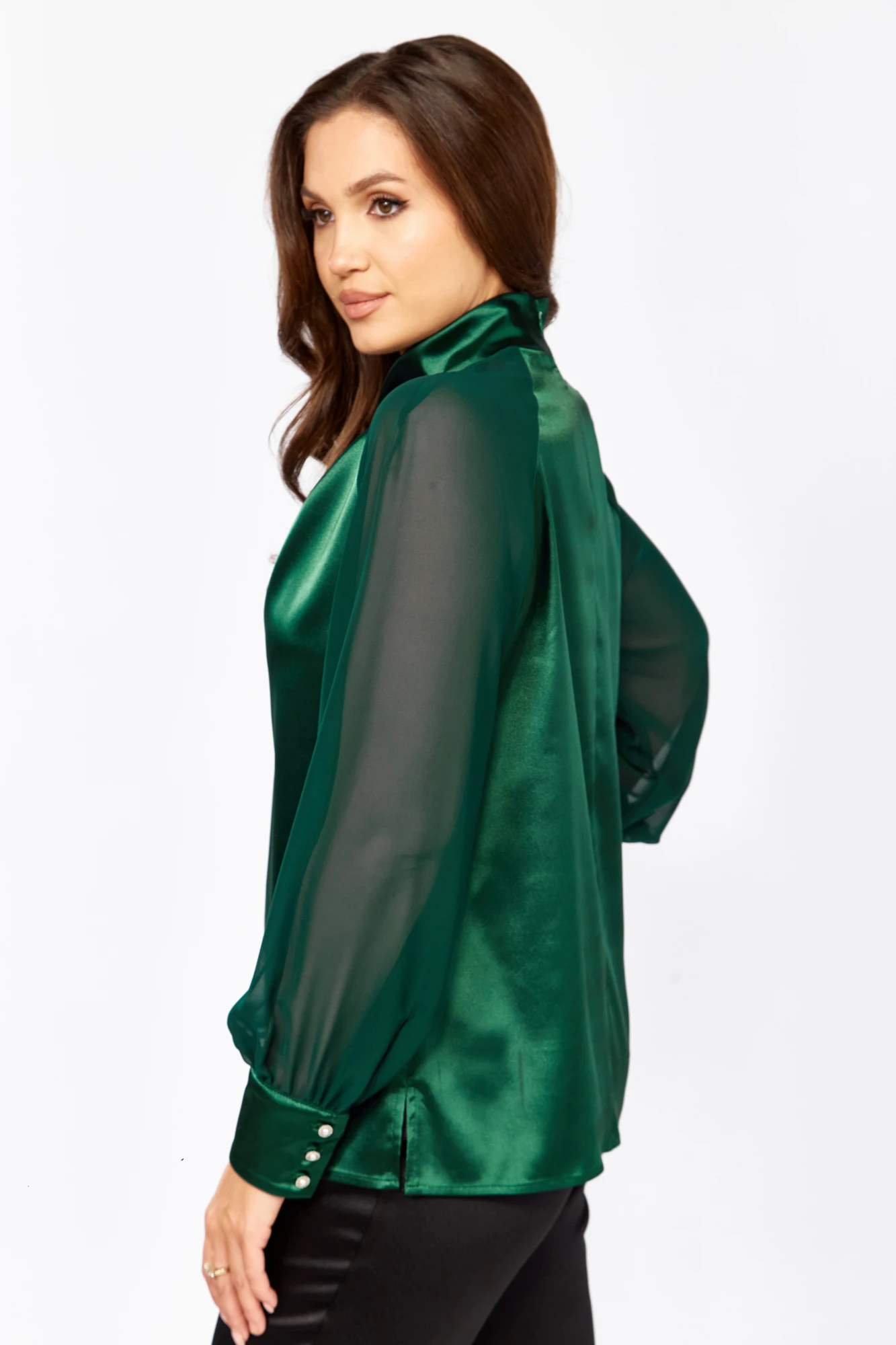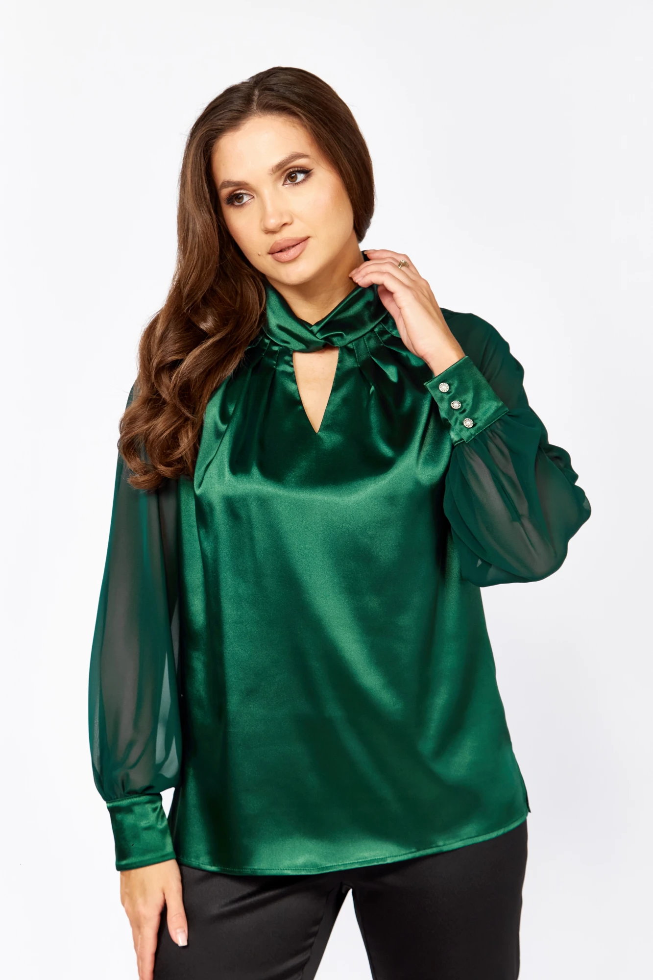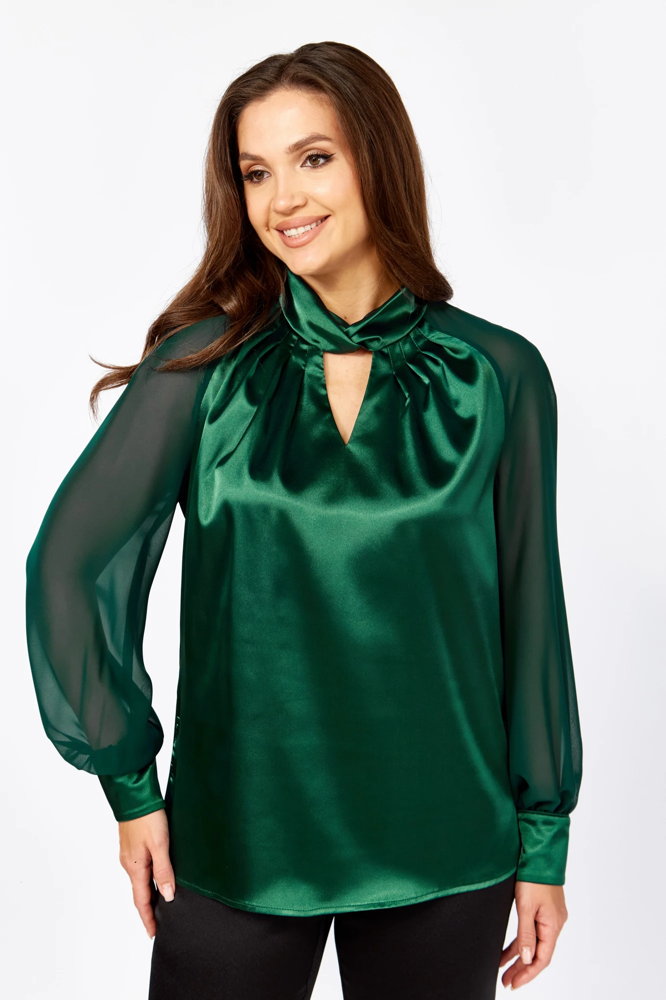 Нарядная блузка из атласной ткани. На полочке складки, небольшой V-образный вырез и декоративная стойка. Спинка со средним швом и застежкой на молнию. В боковых швах по низу разрезы
