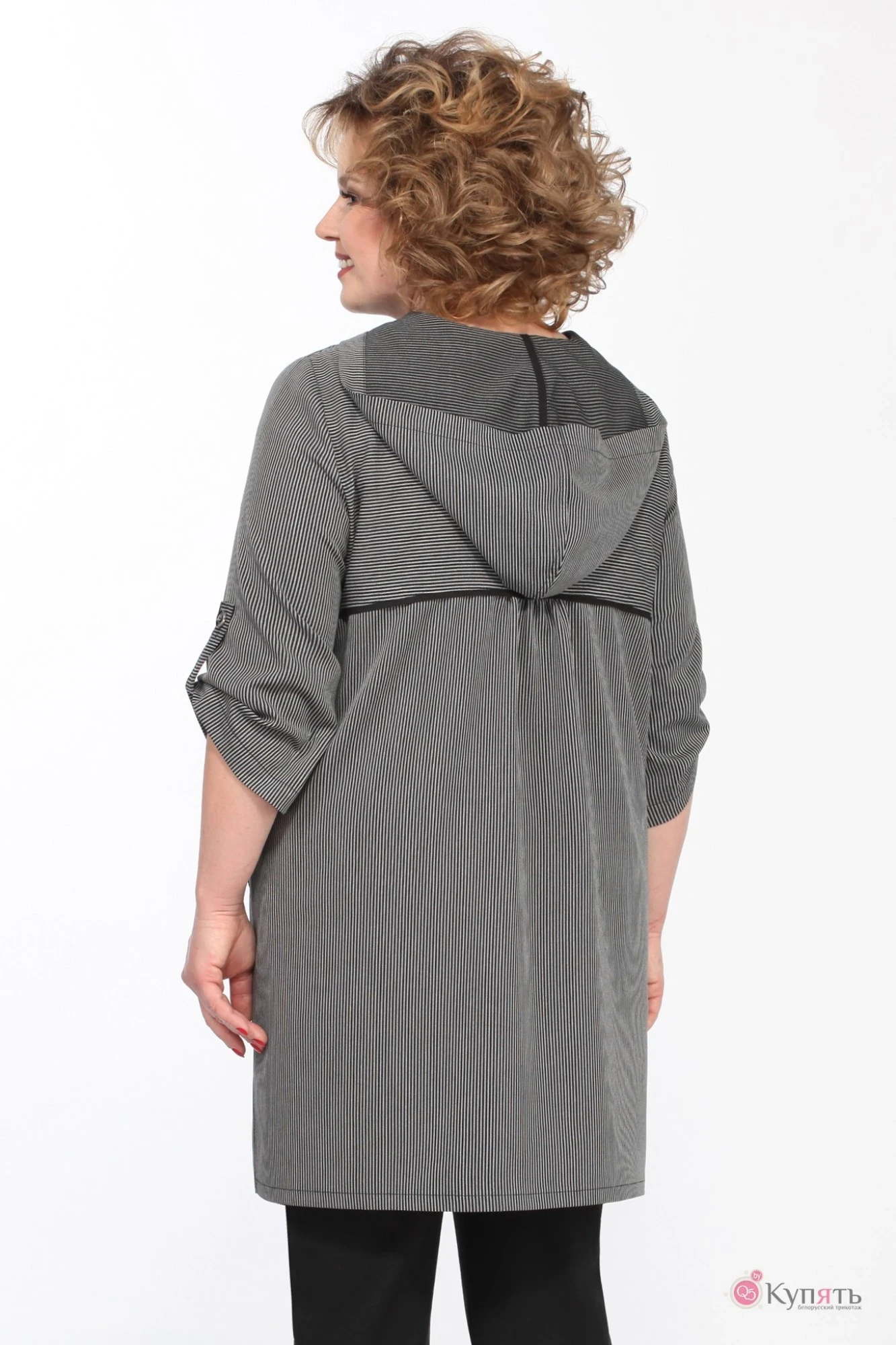 Блузон без подкладки. Перед с отрезной кокеткой по линии груди с двойной отделочной строчкой. Горловина круглая,перед оформлен настрочной обтачкой с отделочными строчками и капюшоном.На полочках накладные карманы с планкой и сборкой. Застежка центральная с отрезной планкой на петли-пуговицы. В боковых швах разрезы. По спинке подрез со сборкой. Рукав одношовный с патой на петлю-пуговицу. Низ прямой с удлиненной спинкой. По кокеткам, планкам, карманам отделочные двойные строчки.