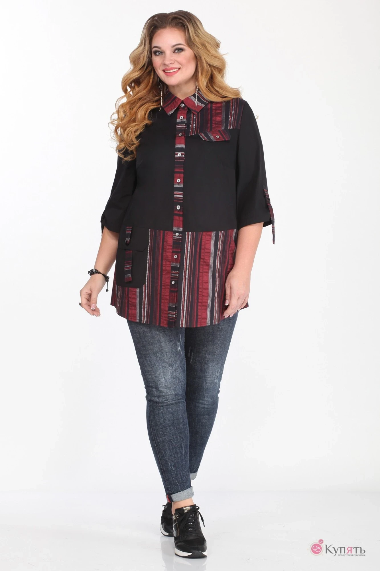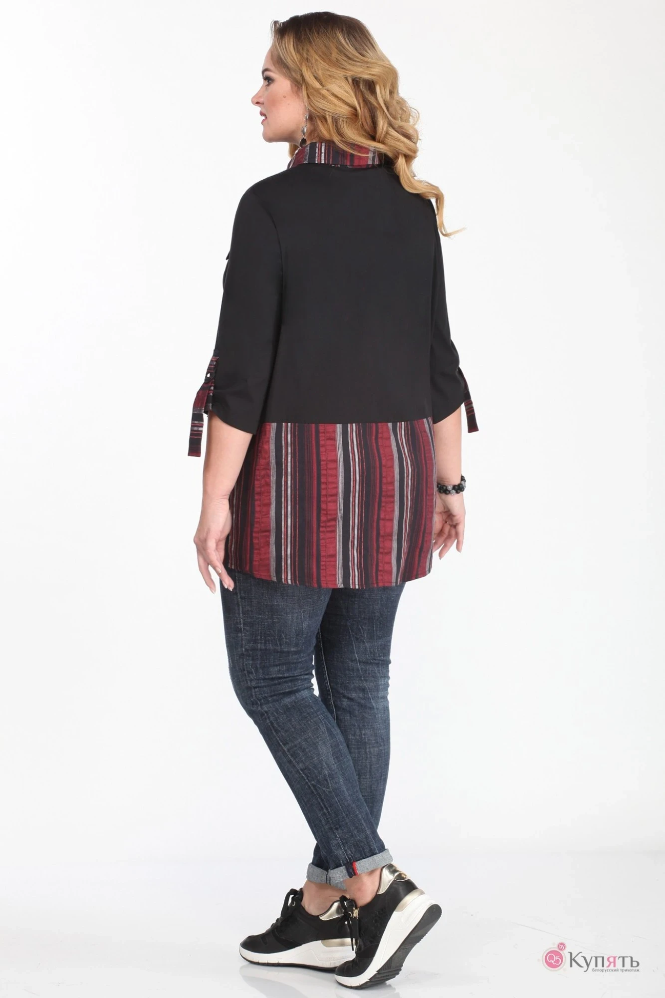 Блузон женский прямого силуэта. Застежка центральная на петли пуговицы с притачными планками. Воротник рубашечный с отрезной стойкой. Блузон скомбинирован из ткани в полоску и однотона. На нижней детали правой полочки накладной карман с клапаном и люверсом. На верхней детали левой полочки клапан. Рукав втачной одношовный, длина 3/4, с патами и полукольцами. Спинка отрезная ниже линии талии.