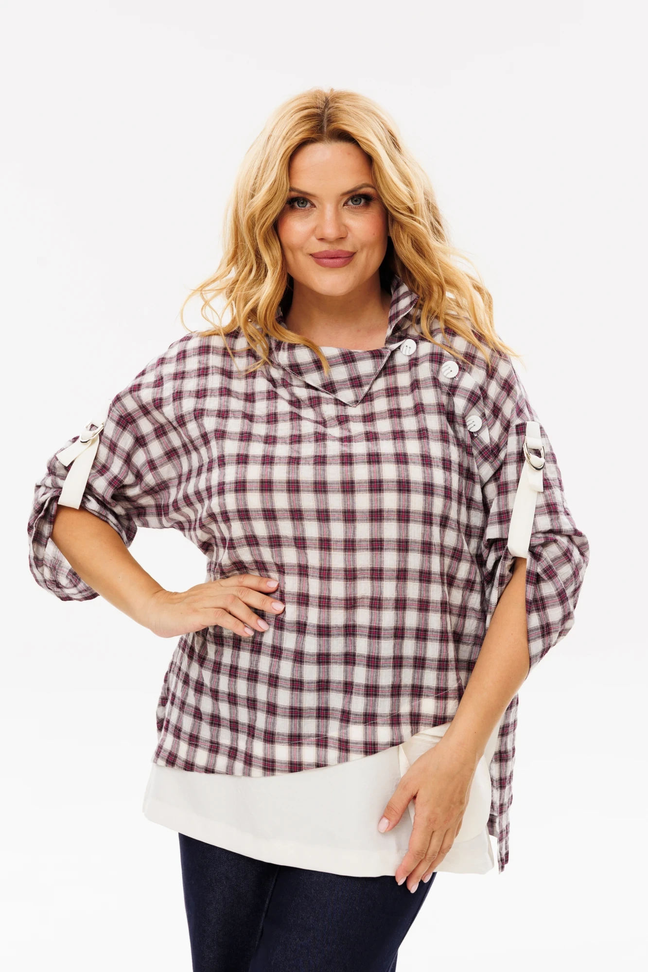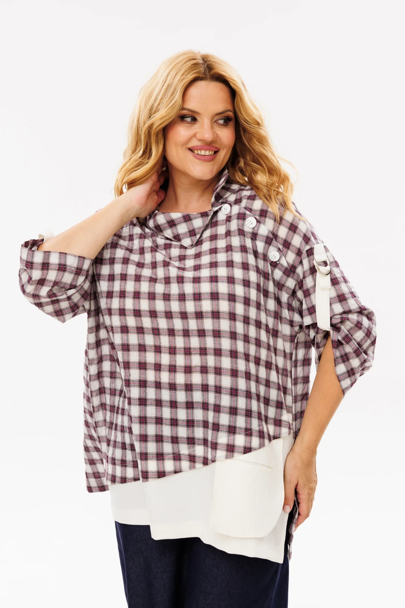 Базовая женская блуза свободного кроя — идеальный вариант как для офиса, так и для прогулок. Изделие выполнено из блузочной ткани. Оригинальный крой блузы, состоящий из двух комбинированных тканей: крупной клетки и однотона. Рубашечный воротник, застегивающийся на пуговицы сбоку. Рукав — ¾, украшен хлястиками на полукольцах. По спинке встречная складка, благодаря которой изделие свободно садится по фигуре. По переду декоративный отлетной карман. Блузка удачно вольется в гардероб и станет незаменимой даже у самой взыскательной хозяйки. Изделие может сочетаться как с кедами, так и туфлями.
