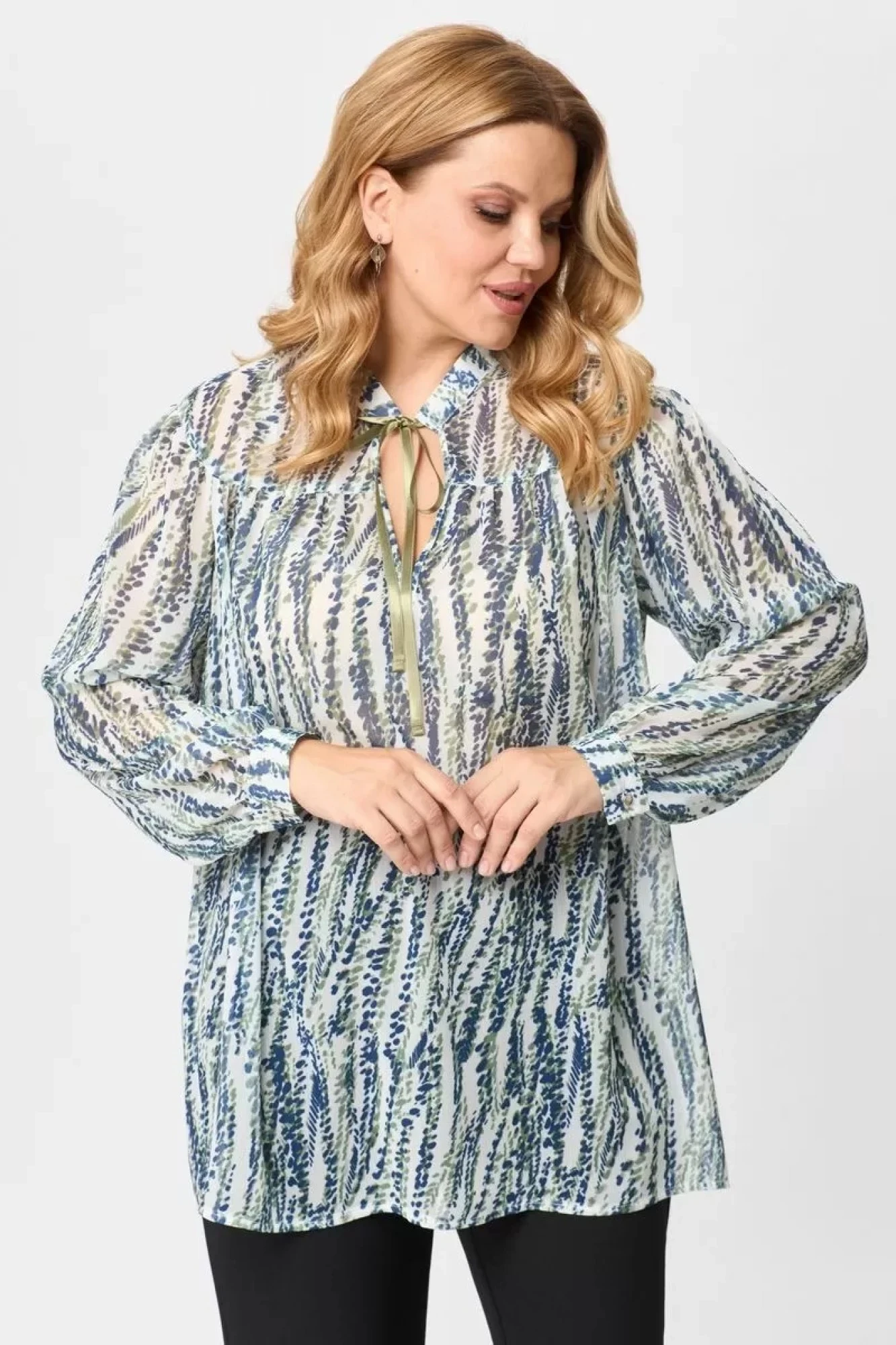 Нежная блузка свободного кроя прекрасно вольется в повседневную жизнь. Изделие хорошо сочетается с брюками и юбками. Блузка выполнена из фактурной тонкой ткани, имеет механический стрейч. Сборка по всей блузке придаст Вашему образу женственности и нежности. Горловина стоечка украшена люрексовой тесьмой, если развязать будет смотреться как украшение.