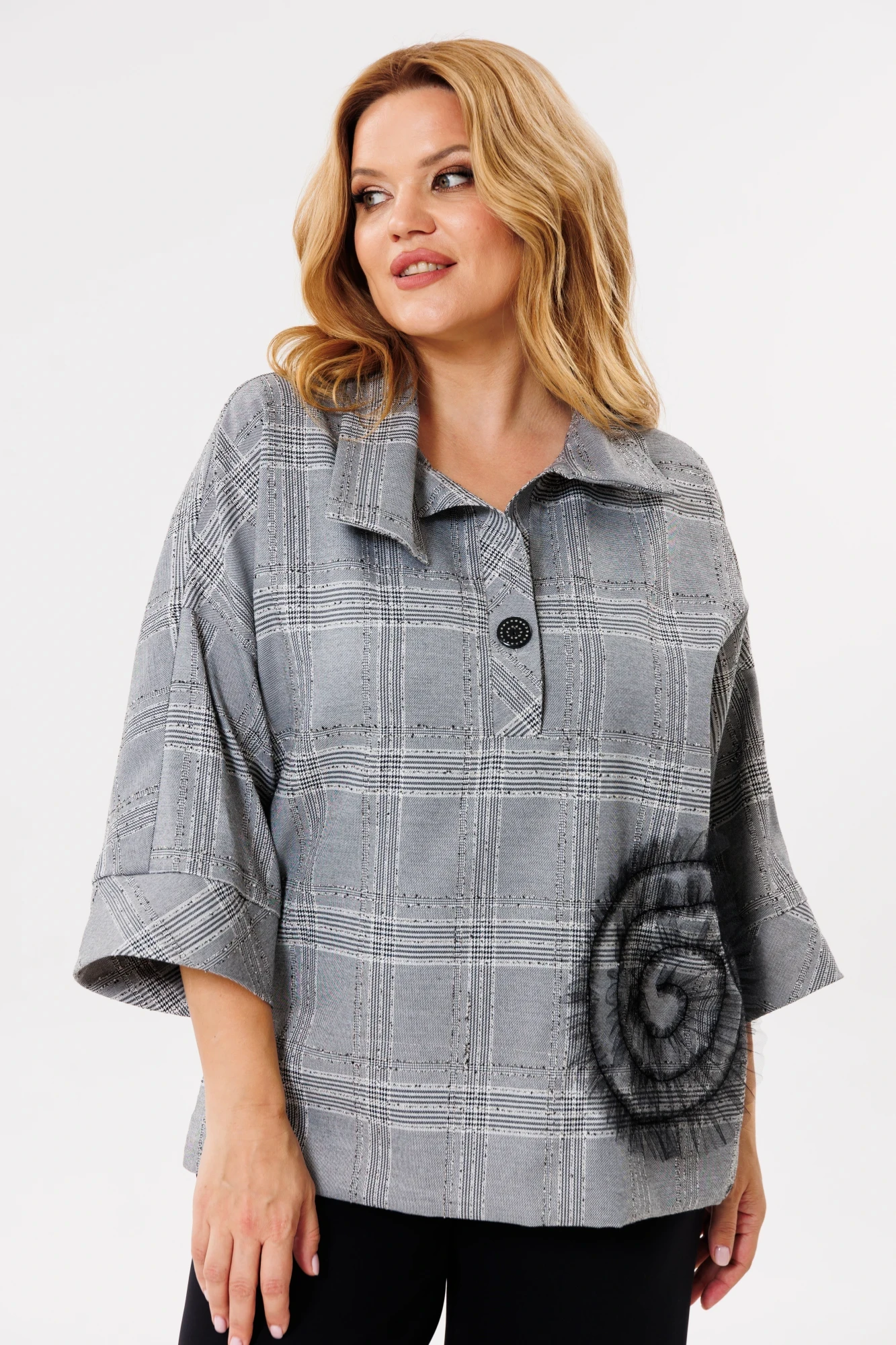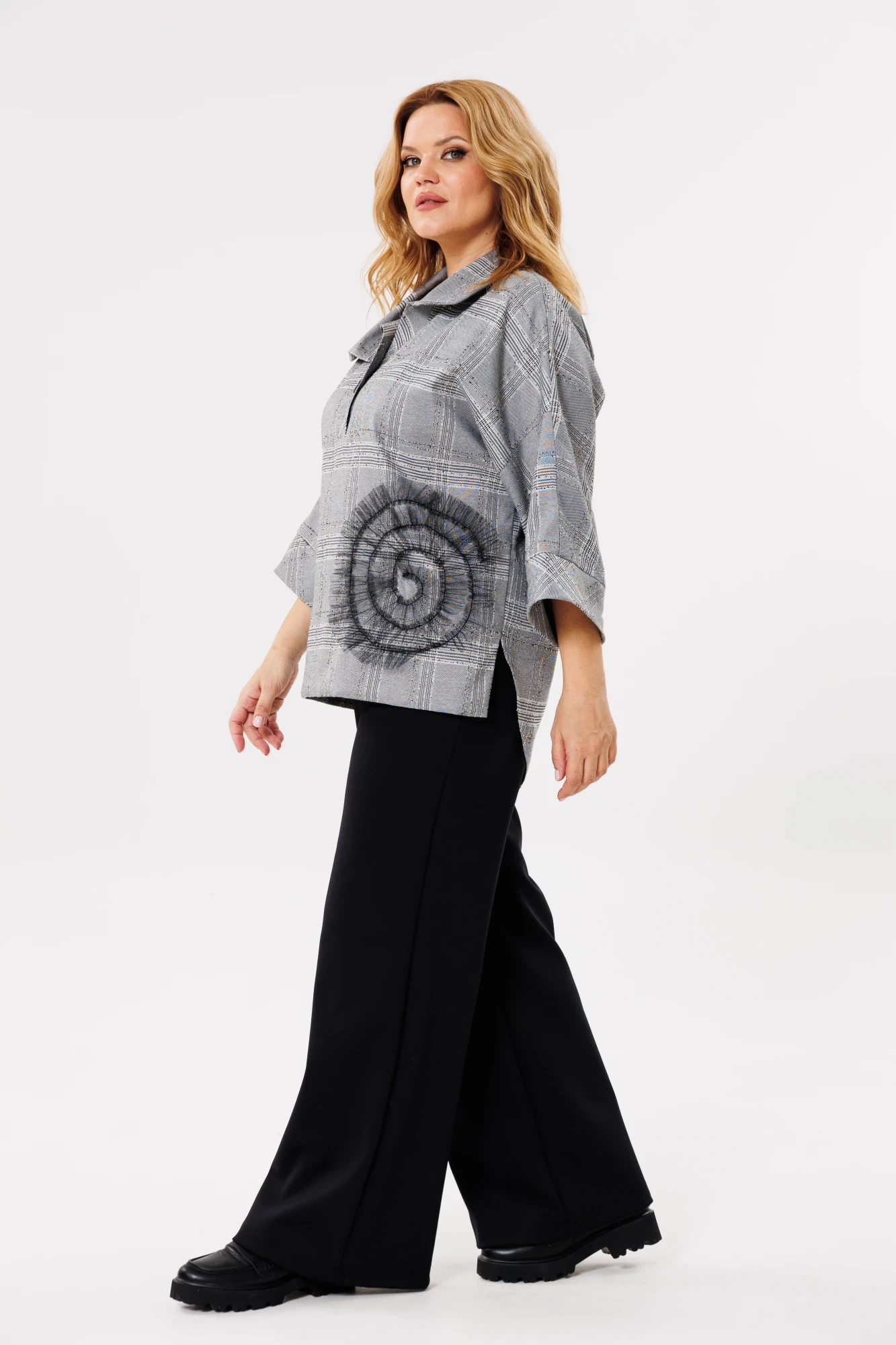 Женская блуза в стиле «бохо» прекрасно вольется в повседневную жизнь и станет одной из любимых базовых вещей в Вашем гардеробе. Блуза свободного кроя. Перед цельный с планкой-застежкой до груди. Спинка с плечевой кокеткой, переходящей в рукав. Рукав 3/4 с притачной манжетой по низу. Из-под кокетки спинки — декоративная строчка, обработанная тесьмой, фигурный низ, по бокам изделия разрезы. По низу переда широкая подгибка. Декорирована блуза настрочным цветком. Изделие хорошо сочетается как с брюками, так и с юбками, с классической и спортивной обувью.