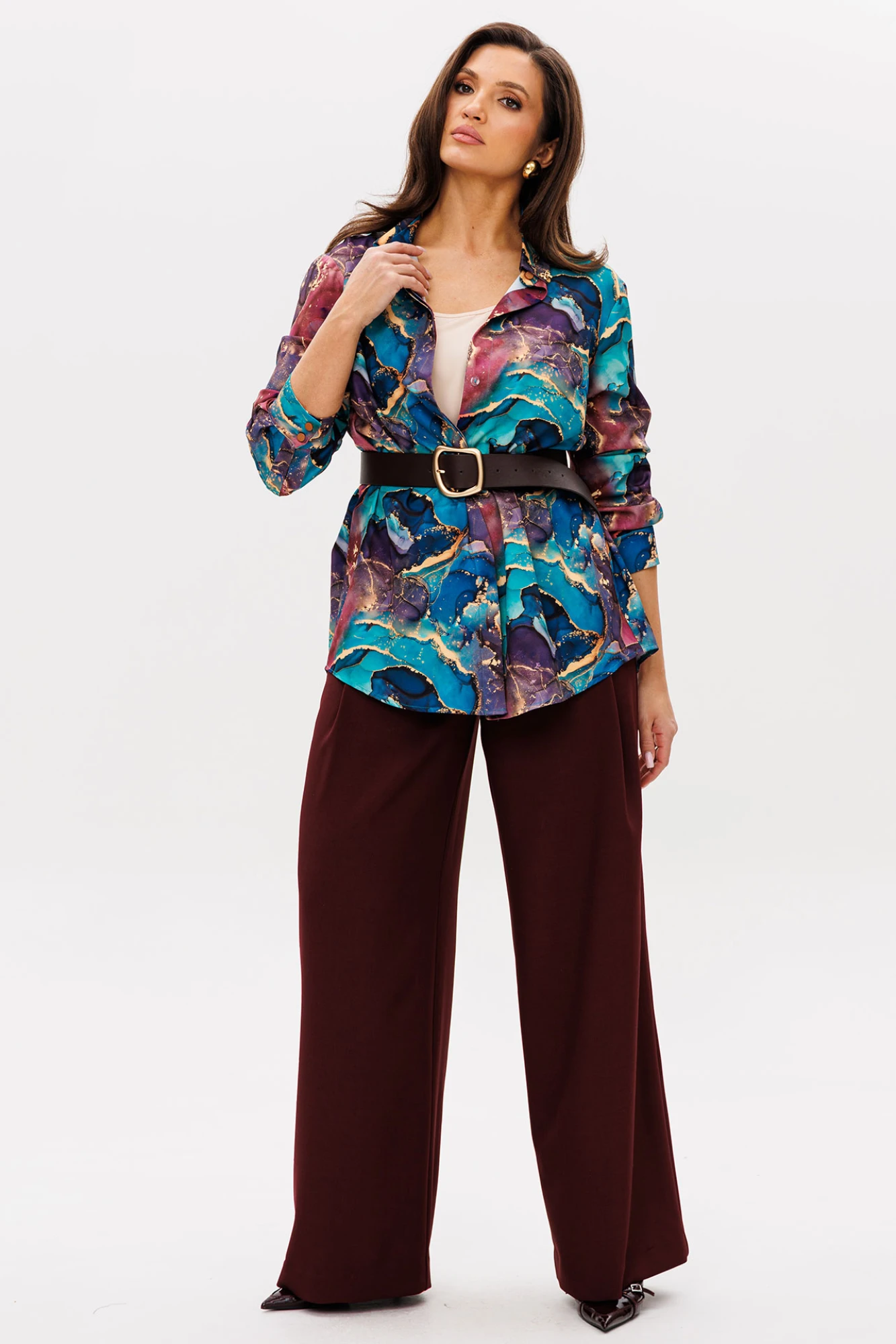 Блуза прямого силуэта с центральной потайной застежкой. Воротник стоячий отложной с отрезной стойкой. Перед с нагрудными вытачками. Спинка с отрезной кокеткой и встречной складкой по центру от кокетки. Рукав втачной, одношовный, рубашечного типа. По низу рукава обработанный разрез, две складки и притачная манжета с застежкой на две пуговицы. У блузы фигурный низ.
