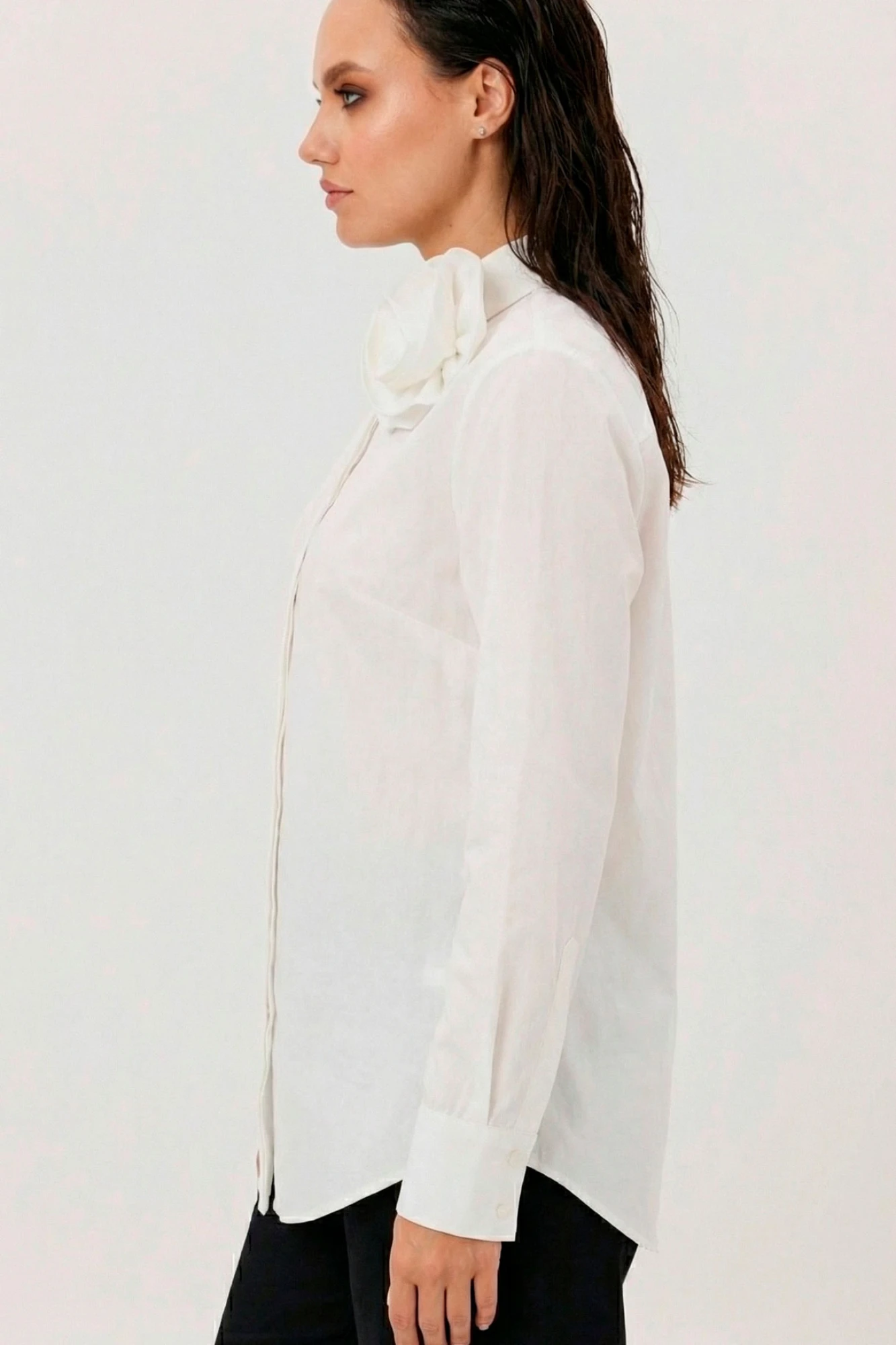 Блуза женская, прямого силуэта с потайной застежкой. Перед с нагрудными вытачками. Спинка с отрезной кокеткой. Воротник рубашечного типа, с отрезной стойкой. Рукав тачной, одношовный, с манжетой по низу. Низ фигурный. Декоративный цветок (съемный, пуговица)