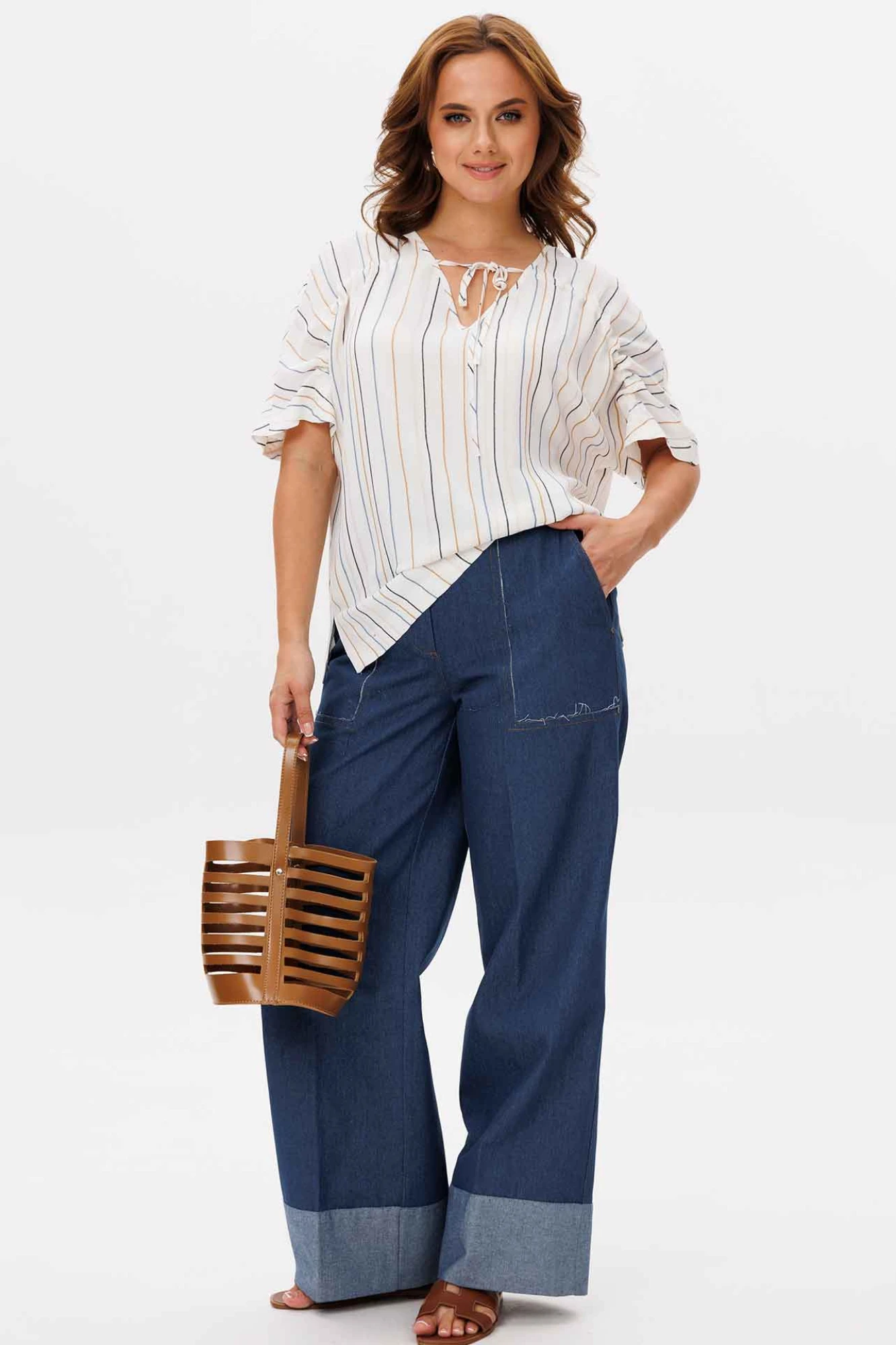 Блуза со спущенными плечами. По переду и спинке горизонтальные кулисы. Горловина V-образная. По бокам небольшие разрезы.