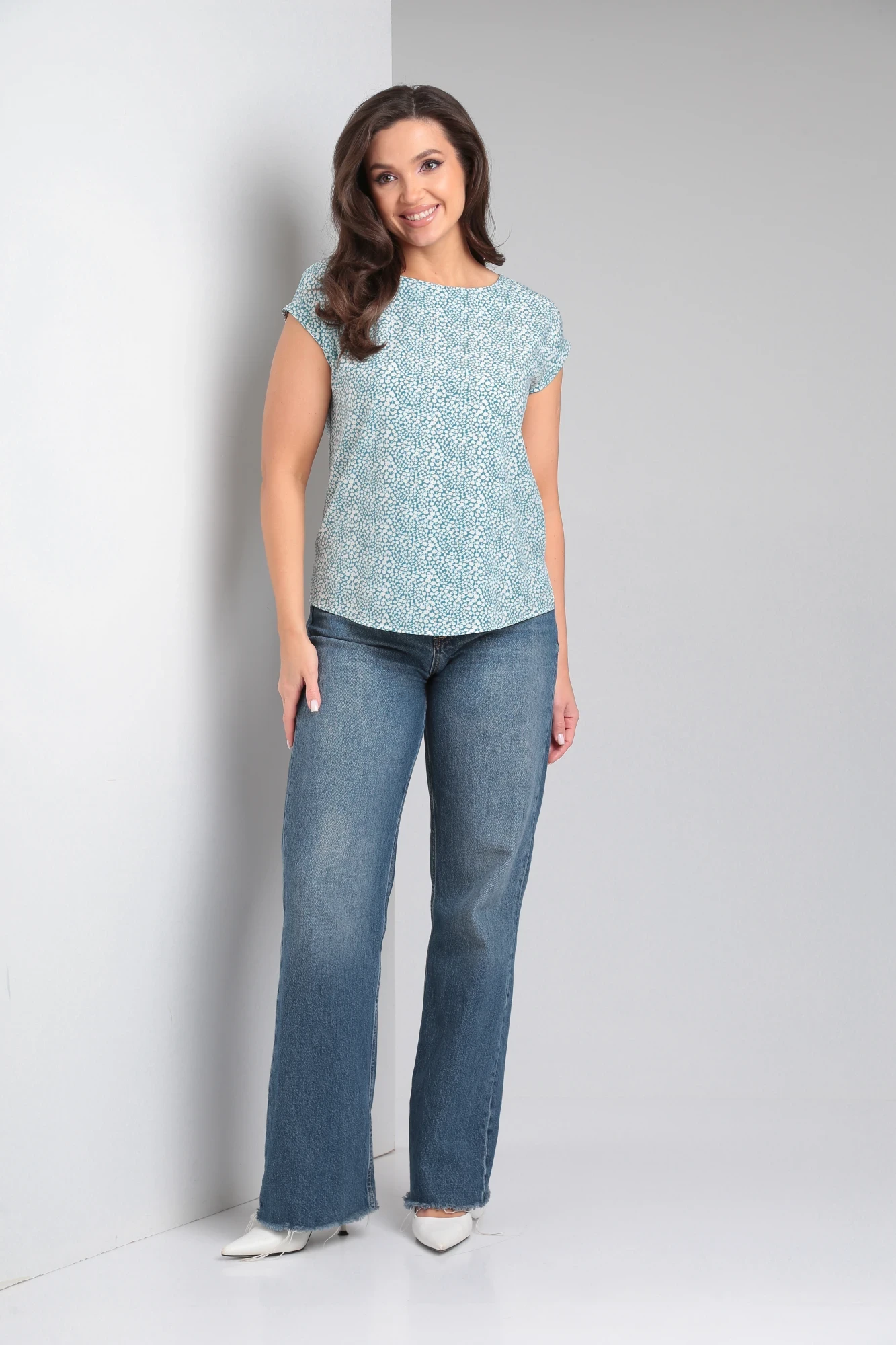Блуза женская свободного силуэта со спущенной линией плеча и коротким рукавом. Перед блузы цельнокроеный с нагрудной вытачкой. Спинка с застежкой по центру до низа на декоративные пуговицы. Горловина округлой формы. По боковым швам внизу разрезы. По краю проймы рукава притачана отложная манжета.