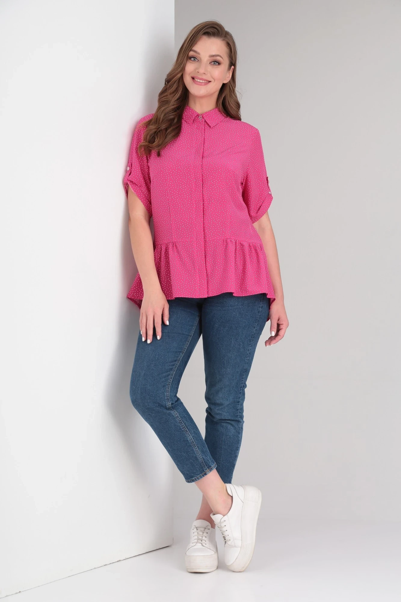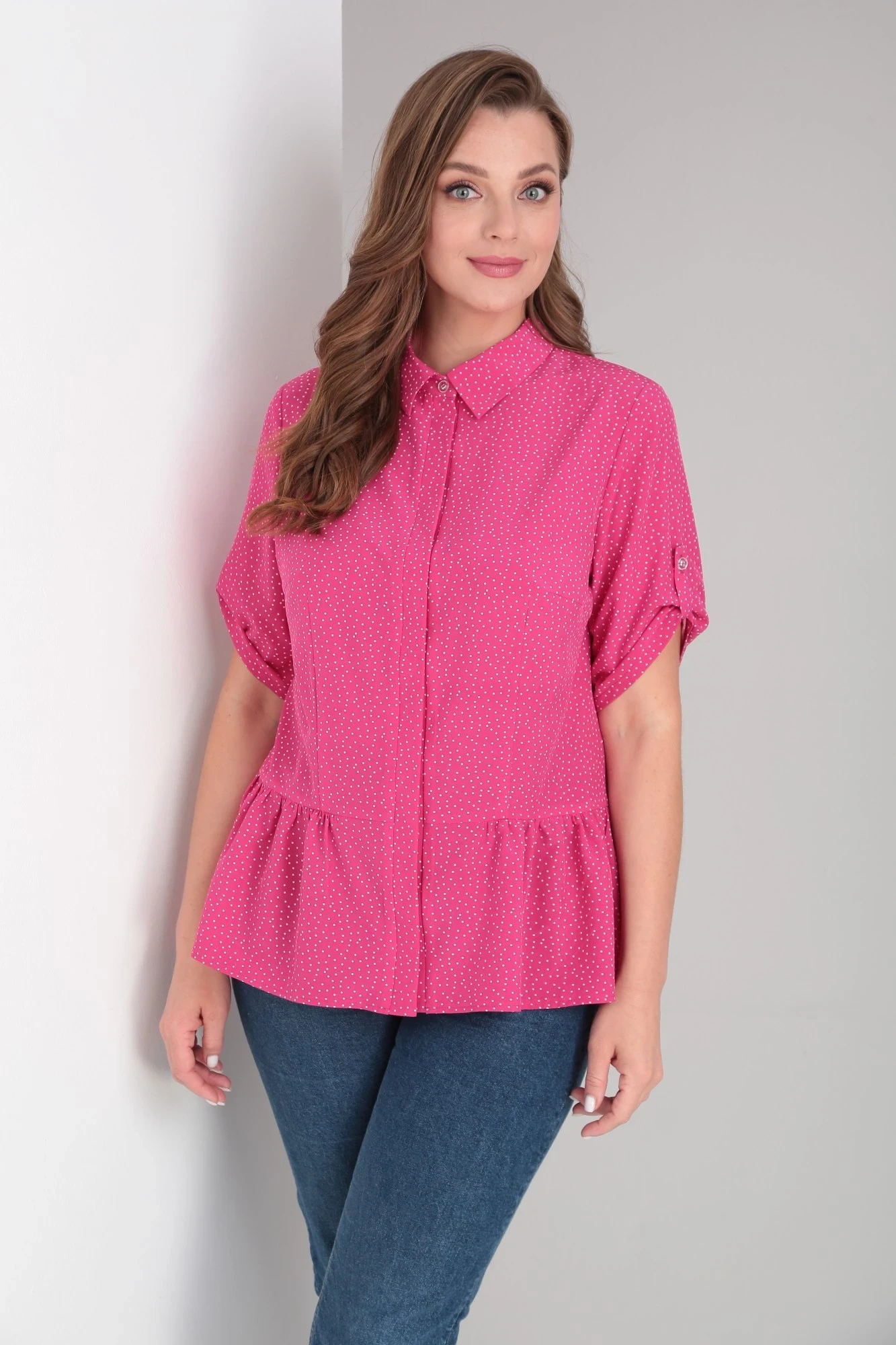 Женская блузка свободного силуэта с рубашечным воротником. Передние полочки изделия отрезные с нагрудными и рельефными вытачками. По переду блузки потайная планка на застежку на пуговицы. Рукав прямой, втачной, длинной до локтя с патой на пуговицу. Спинка с кокеткой и сборкой. Низ изделия рельефный, спинка длиннее.