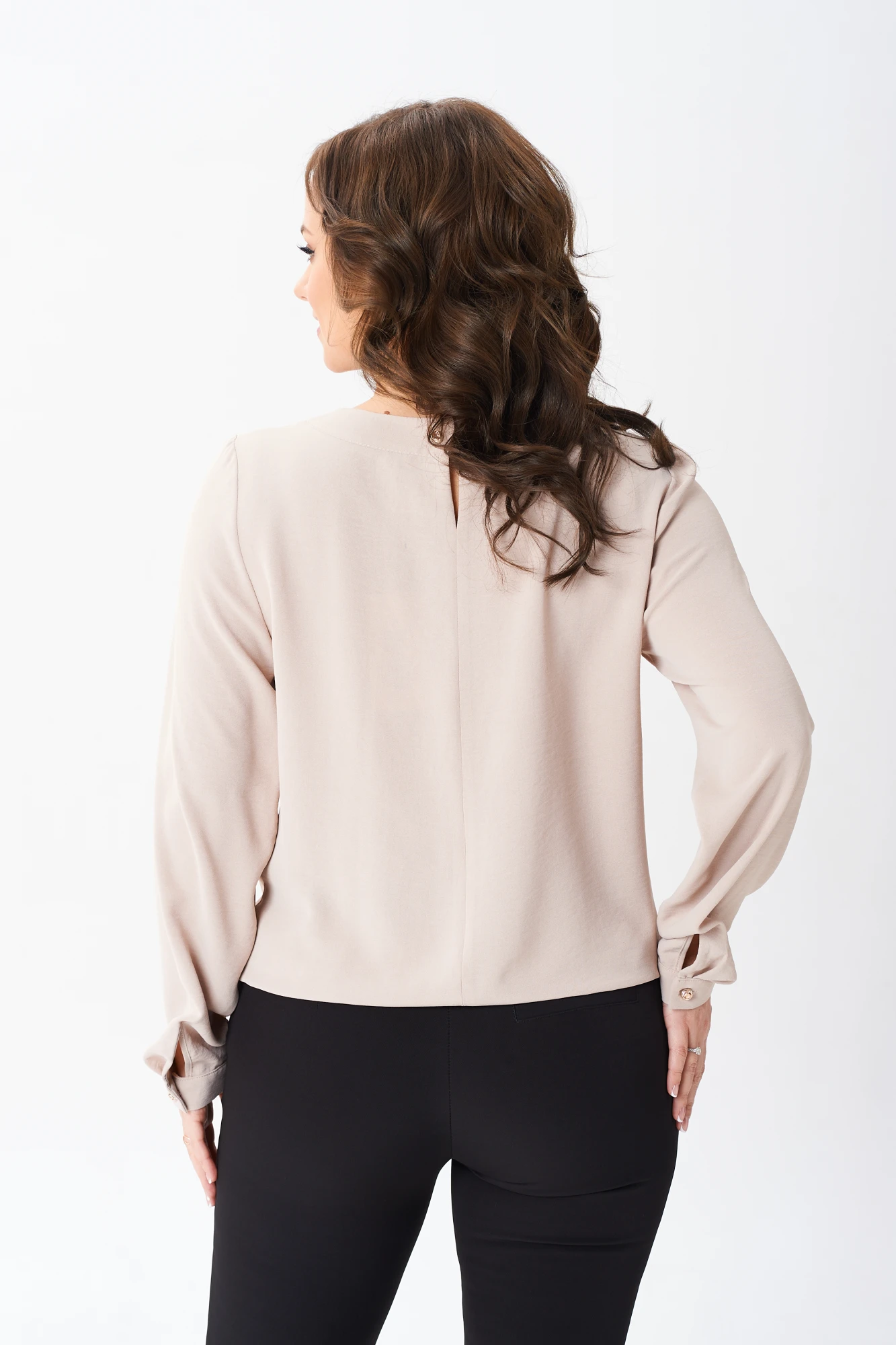 Женская нарядная блузка. По переду заложена планка с двумя мягкими складками украшенная съёмным украшением. Спинка блузки со средним швом и застёжкой на пуговицу. Рукав длинный с манжетой на застежку петля-пуговица. Низ изделия на эластичной резинке.