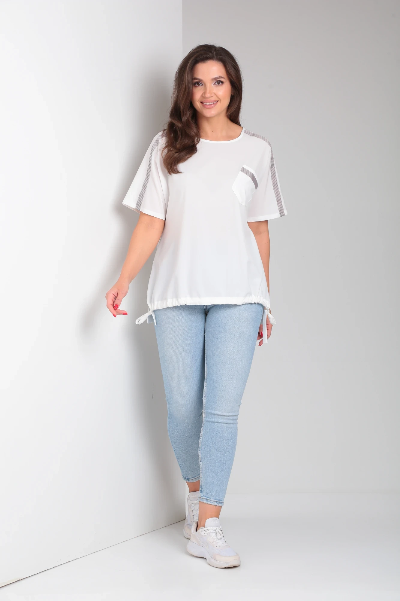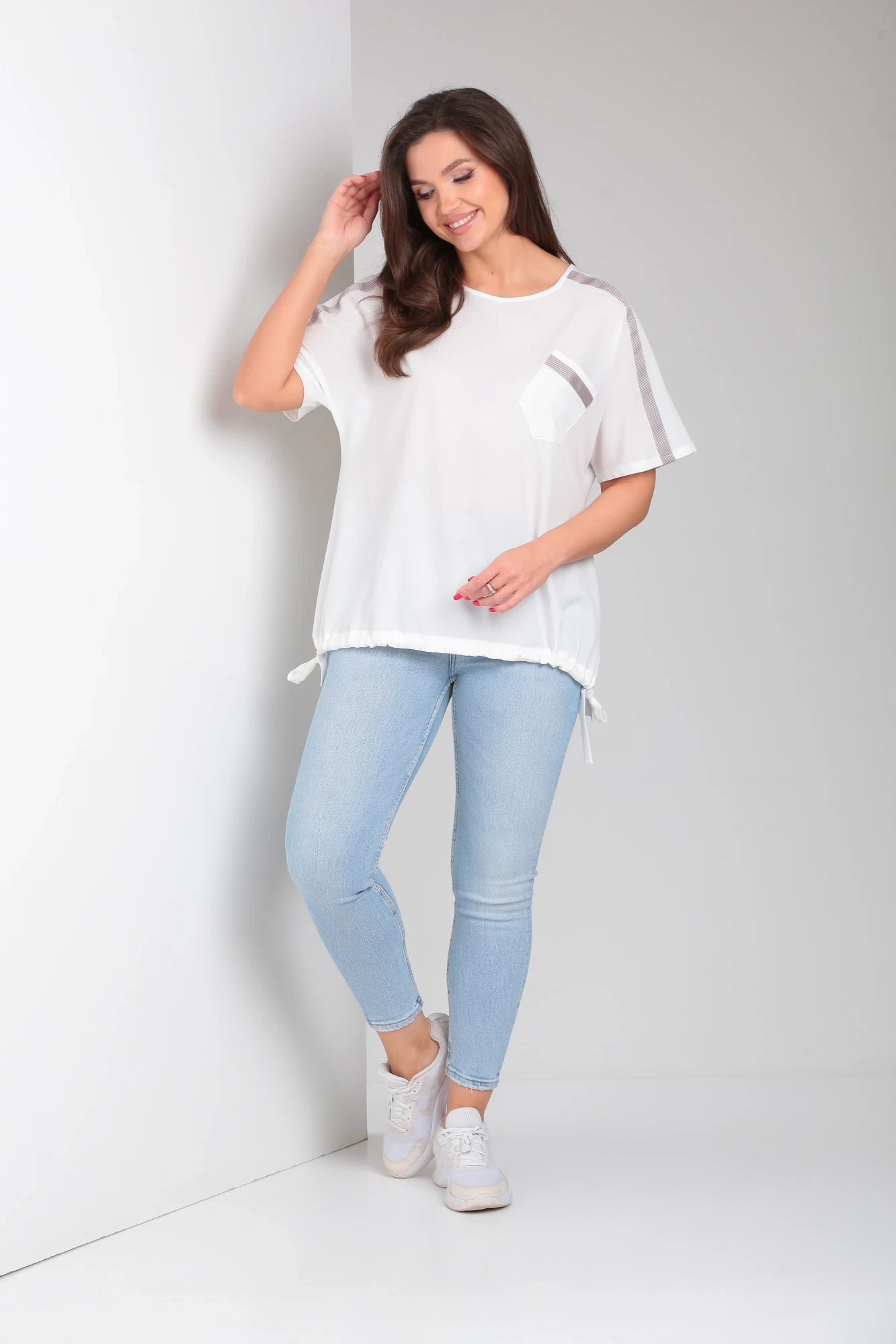 Современная женская блузка свободного силуэт с цельнокроеным рукавом и кокеткой полочки и спинки. По переду блузы накладной карман. Понизу полочка переда стянута шнуром из основной ткани. По боковым швам разрезы. Горловина окантована, округлой формы. Спинка блузы прямая стачная. По плечевым швам и на кармане настрочена отделочная лента.
