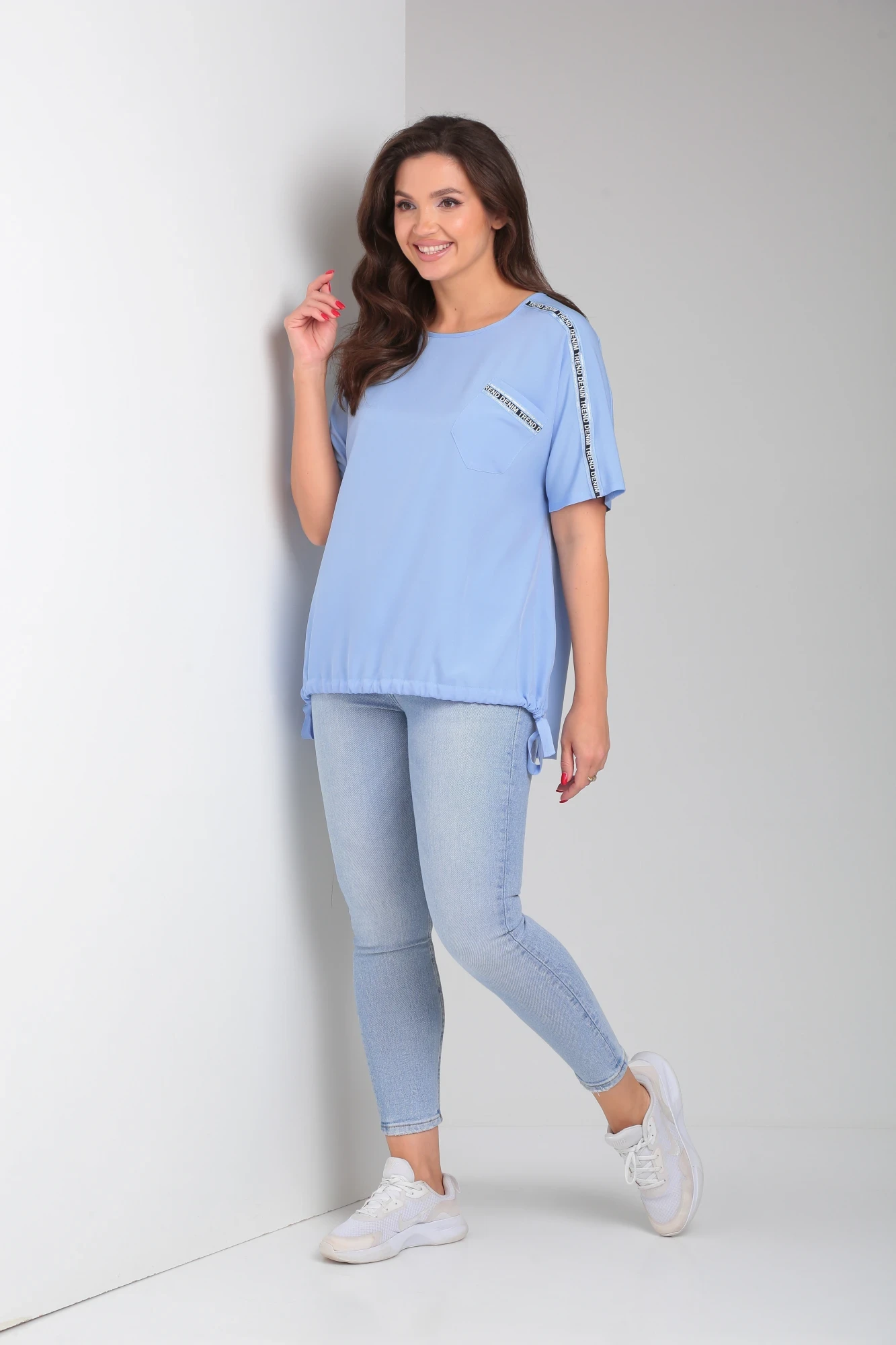 Современная женская блузка свободного силуэт с цельнокроеным рукавом и кокеткой полочки и спинки. По переду блузы накладной карман. Понизу полочка переда стянута шнуром из основной ткани. По боковым швам разрезы. Горловина окантована, округлой формы. Спинка блузы прямая стачная. По плечевым швам и на кармане настрочена отделочная лента.